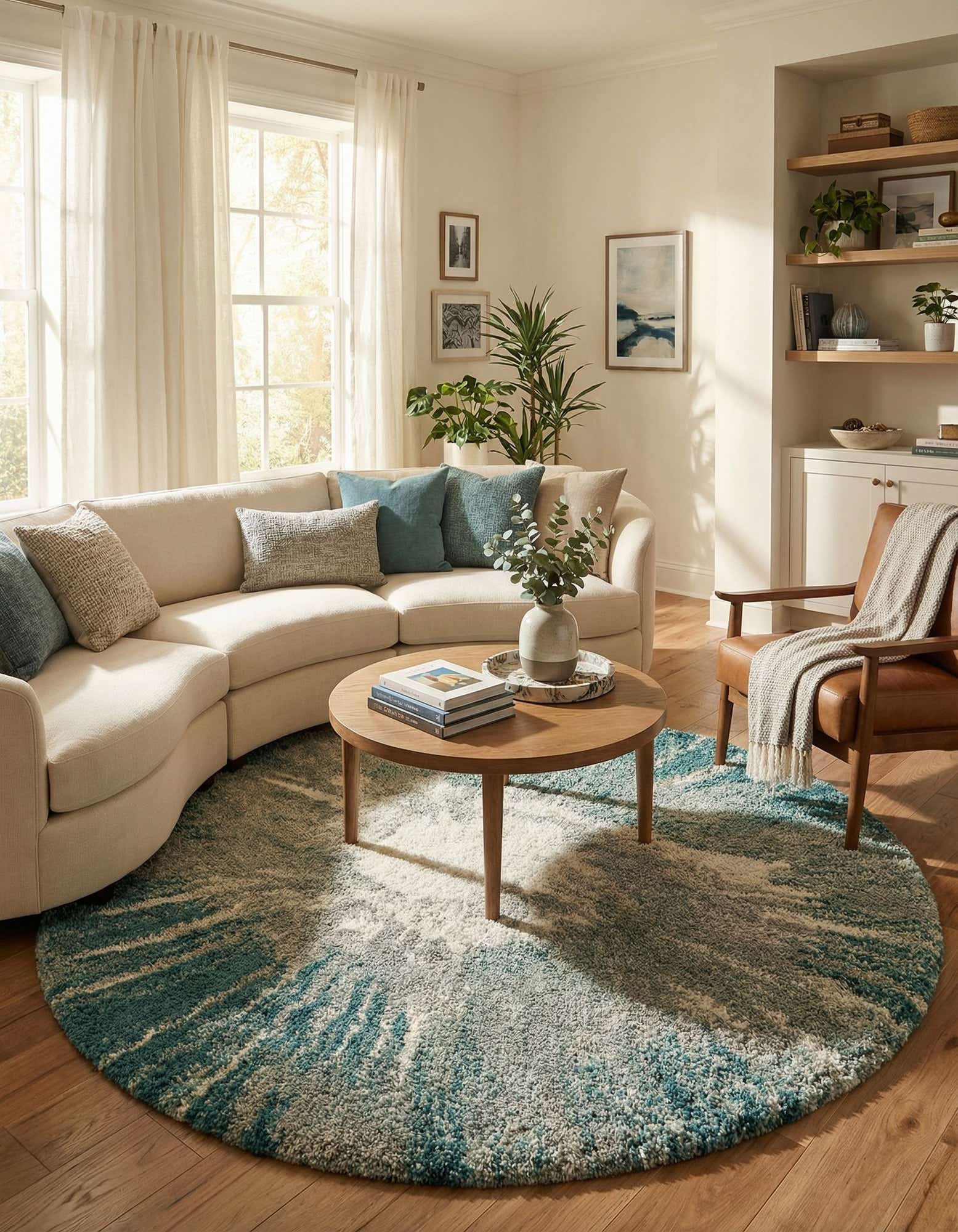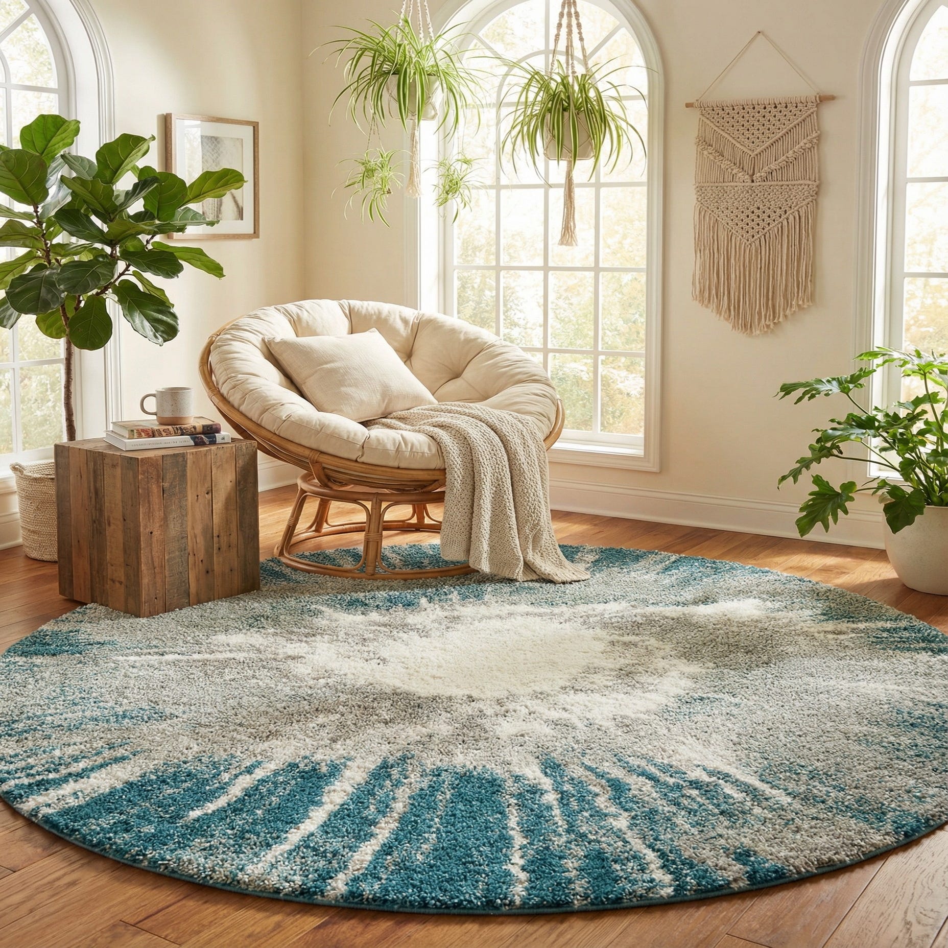 Place this piece to anchor a seating group, beneath a round dining table, or beside a bed to add a cozy focal point. The teal ground pairs well with light wood and natural textiles for a relaxed, coastal-inspired look, while the gray and ivory tones keep it adaptable in contemporary or transitional interiors. The round shape encourages circular furniture arrangements and works particularly well in smaller living spaces, reading nooks, or open-plan rooms where you want a soft, tactile centerpiece.