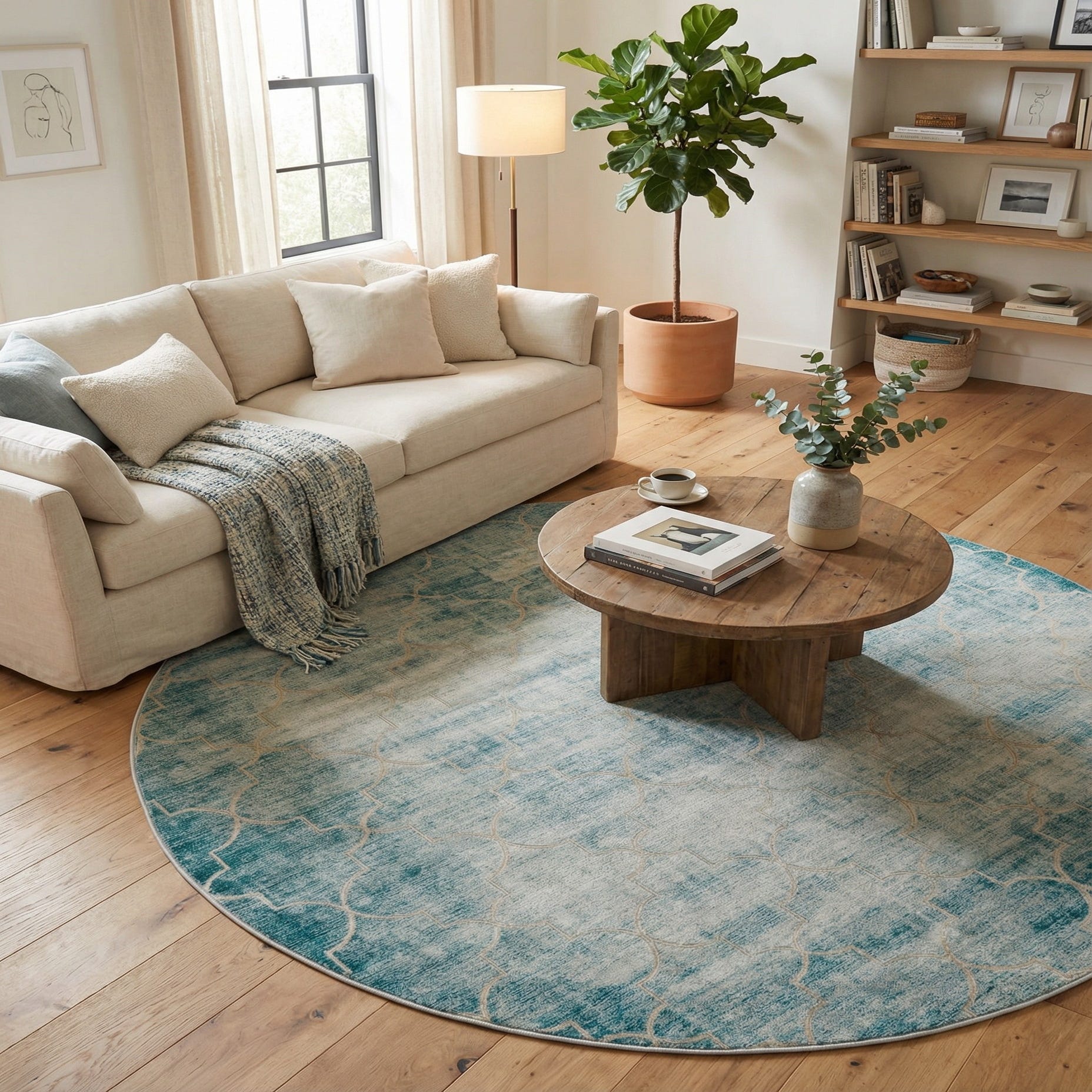 This piece works well layered beneath a round coffee table, centered in a cozy bedroom seating area, or placed under a dining table to define the space. The teal background brings a calm, modern color anchor while the ivory pattern keeps the look light—pair it with light woods and neutral upholstery for a coastal feel, with brass accents and clean lines for a contemporary look, or with mid-century furnishings for a balanced, transitional scheme.