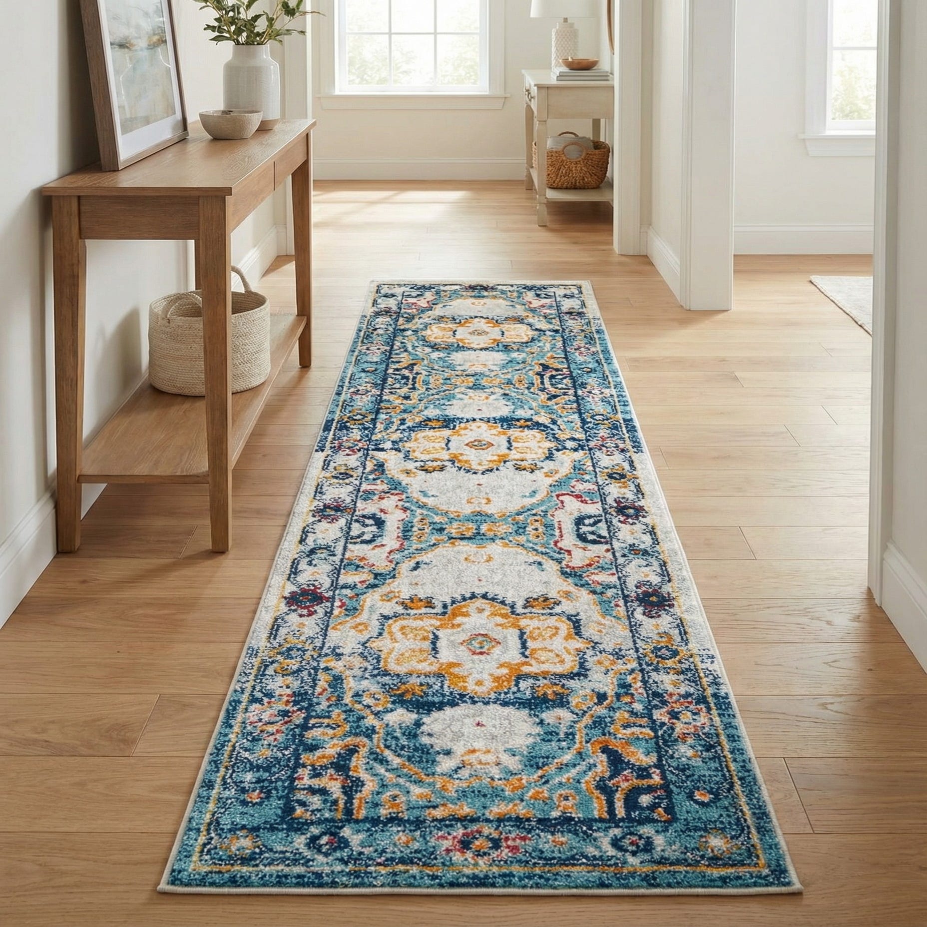 Machine made of 100% polypropylene, the rug has a low-to-medium pile with a soft, slightly dense hand and subtle texture variation that enhances the aged look. Its color palette and scale make it a strong choice for a hallway or entry, a kitchen runner beside an island, or layered along the side of a bed. It complements coastal, transitional, and eclectic interiors—pair it with light wood floors and brass or matte-black accents for contrast, or place it under a narrow console table to add color without overwhelming the space.