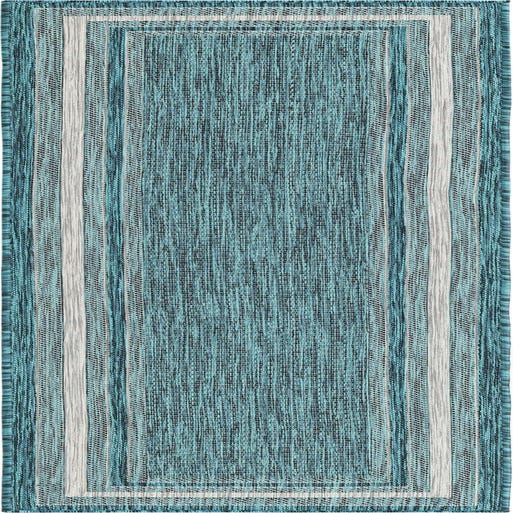 The Outdoor Border Collection presents a versatile 8 Ft Runner rug that features a contemporary border design, ideal for complementing a variety of outdoor and indoor spaces. The rug showcases a striking teal background, elegantly framed by ivory and gray linear patterns that create a clean and structured aesthetic.