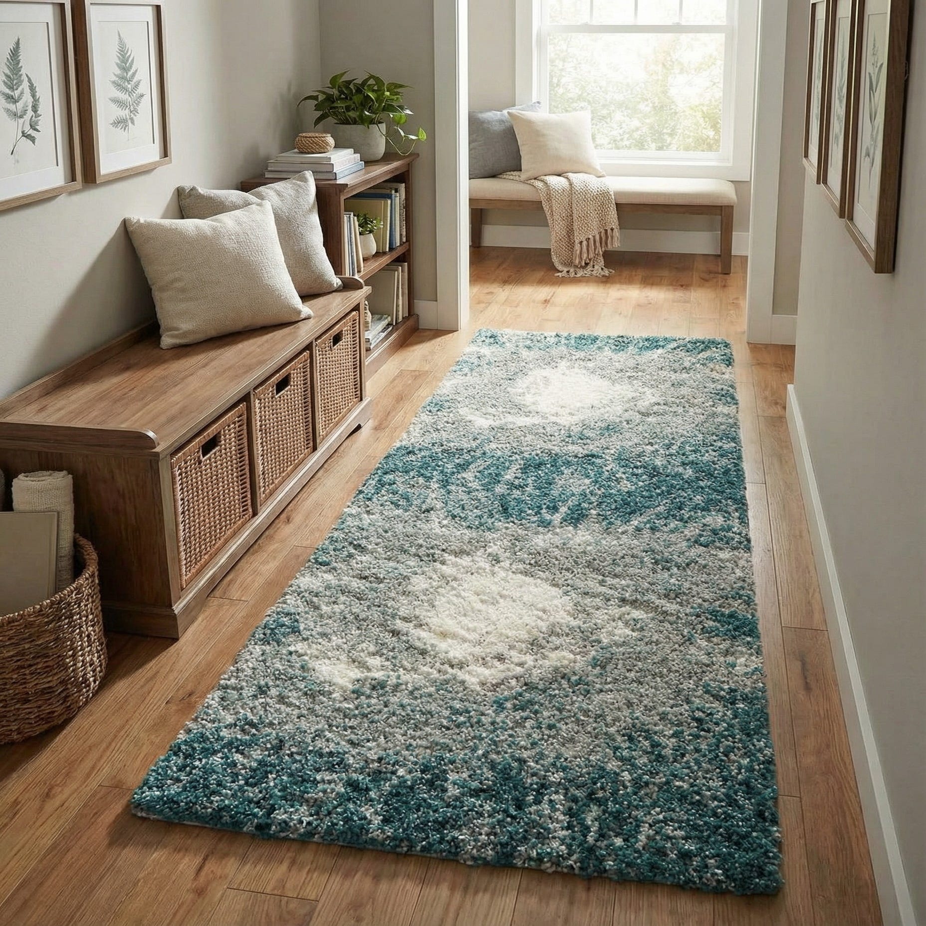 This runner works well in narrow spaces where you want both comfort and color—think entryways, hallways, or alongside a bed. Pair it with light woods and neutral upholstery for a contemporary, coastal-leaning scheme, or mix it with gray sofas and metallic accents in a modern living area to emphasize the teal and ivory highlights. It also provides a soft, inviting path in transitional interiors that balance clean lines with layered textures.