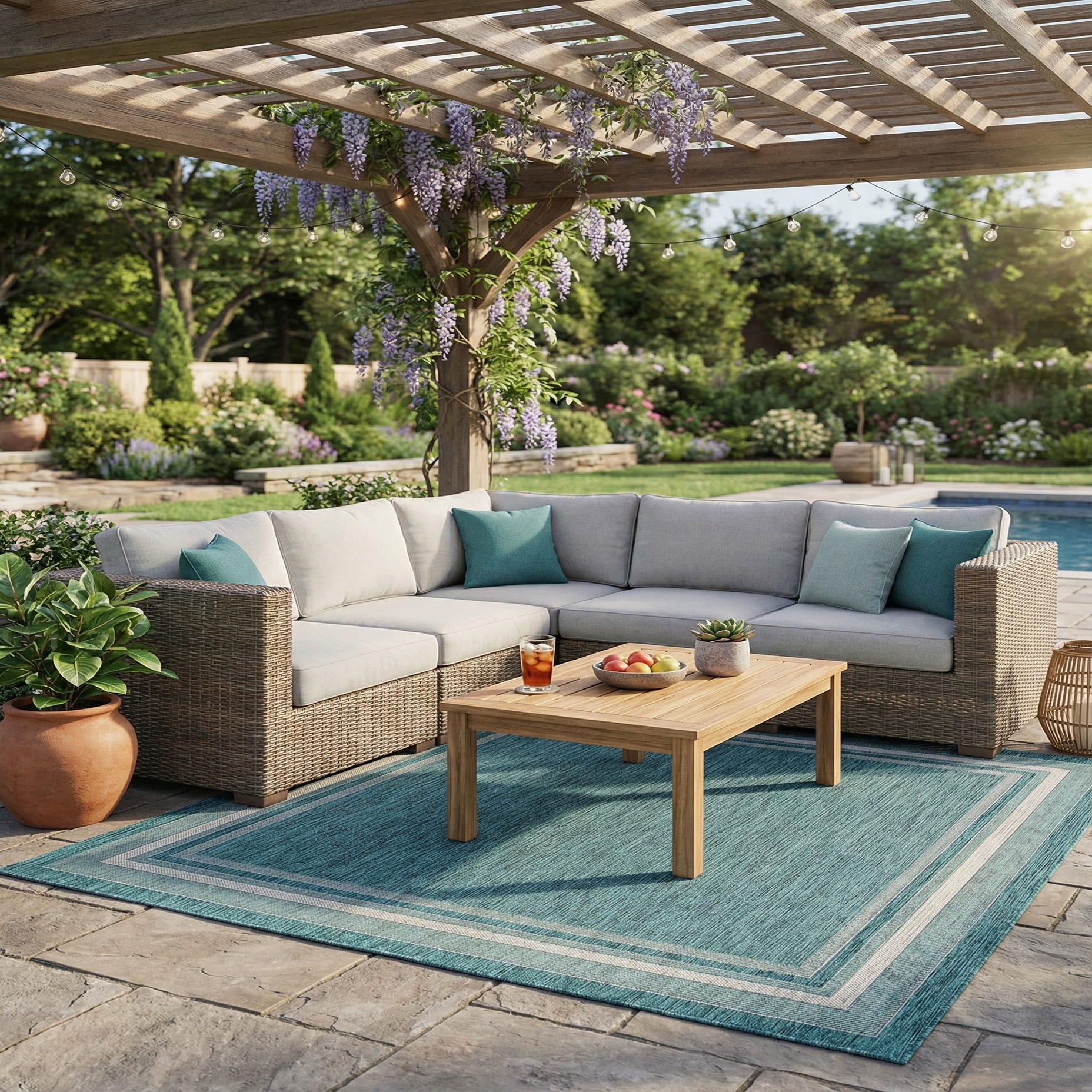 This rug is adaptable to a multitude of spaces, particularly excelling in outdoor settings such as patios, decks, and poolside areas due to its weather-resistant qualities. It would complement modern and coastal-themed decors, thanks to its refreshing color palette and unassuming pattern. Equally, it can serve as a statement piece within a minimalist interior, or add a splash of color to a neutral-toned room, enhancing the overall aesthetic with its crisp and current design language.