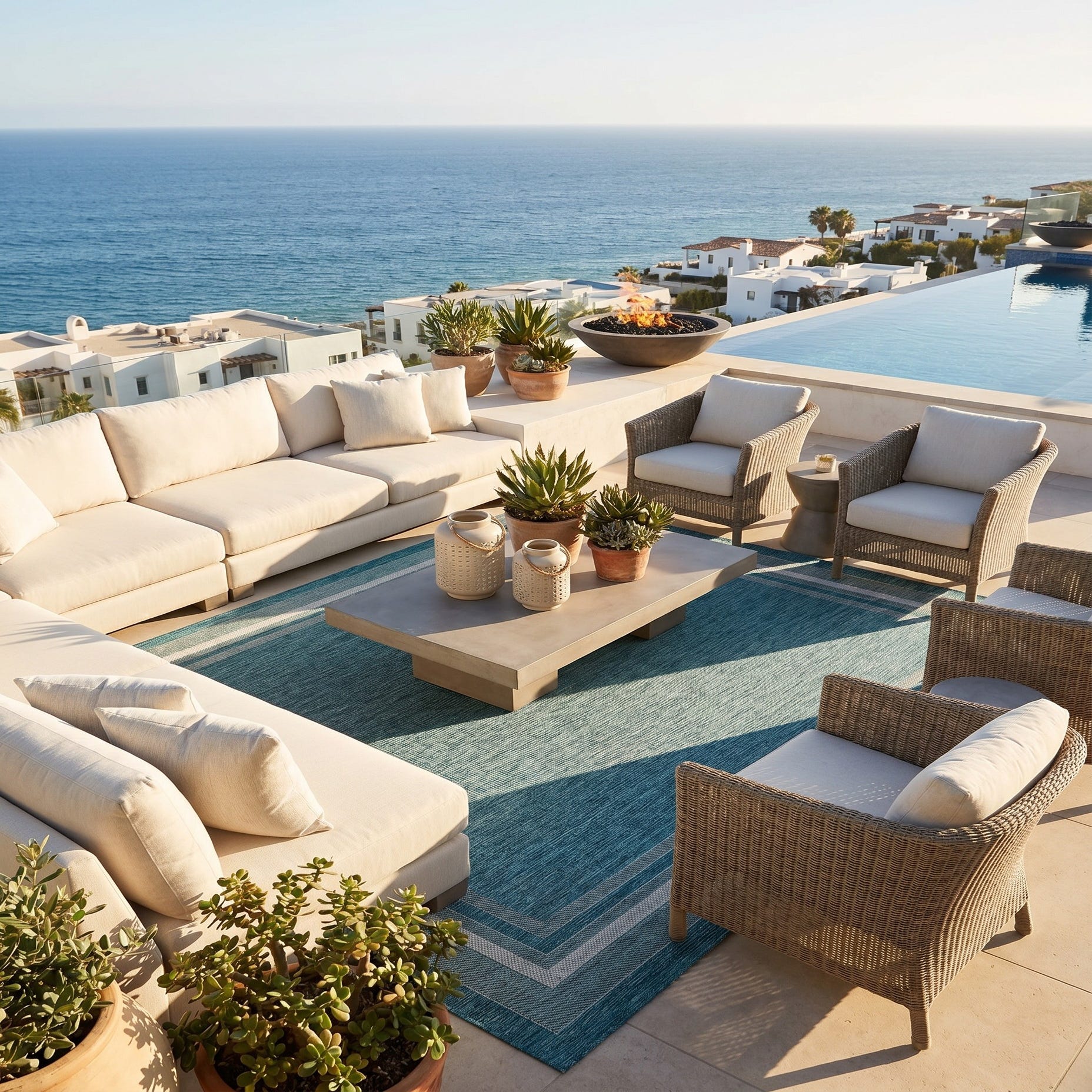 We needed to replace old deck rugs as the old ones had become stained and unsightly over the years. Found this size and pattern and initially wanted the lighter color but it was unavailable. We thought we were settling but turns out this color really enhances our drab concrete deck and looks great with rattan furniture. They came folded not rolled and I was concerned about them flattening out. No problem. They dry quickly after a rain (our old ones took forever) as they are a little lighter (less thick) than old rugs. I was initially concerned about this but don’t expect it to be a problem. Now we just need to see how they weather over the season.
