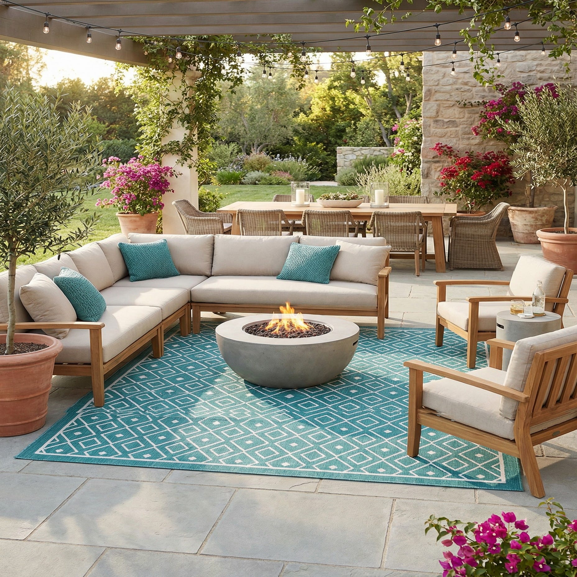 This piece works well on a covered patio, poolside seating area, or sunroom where weather-ready materials and bold color make an impact. It also complements coastal and contemporary interiors—pair it with natural wicker, painted wood, or streamlined metal furniture and neutral cushions for a relaxed, pulled-together look. Use it under an outdoor dining table, layered on a deck, or in a bright, casual living area to anchor seating and add a pop of color.