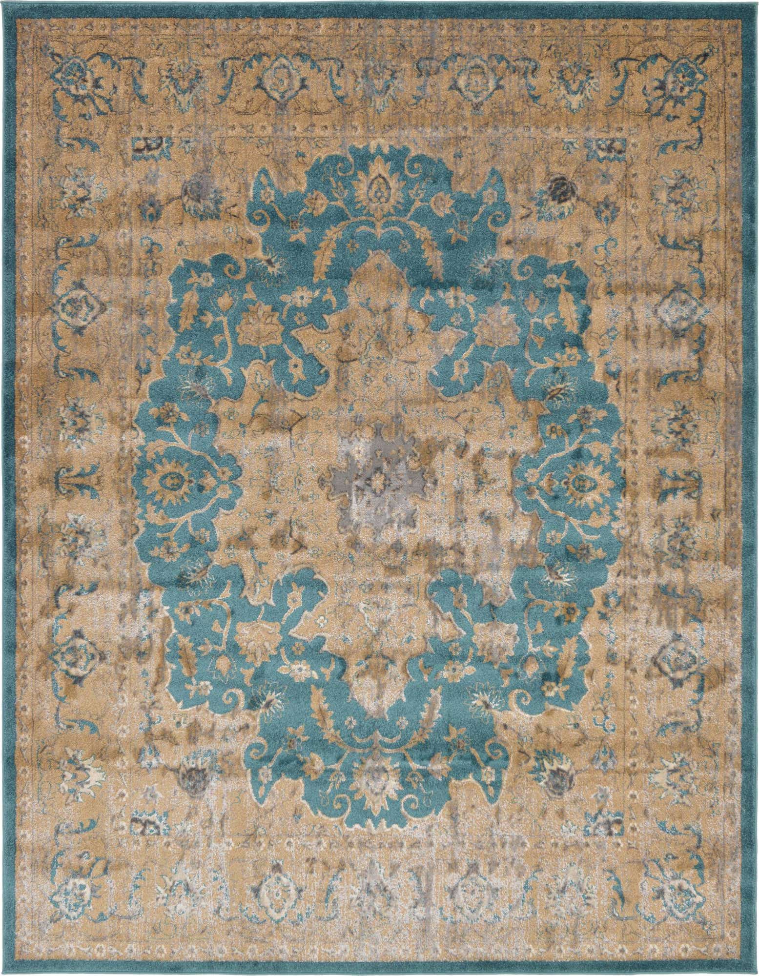 Primary color is Teal. Colors in this rug include: Teal, Blue, Gray, Light Brown.