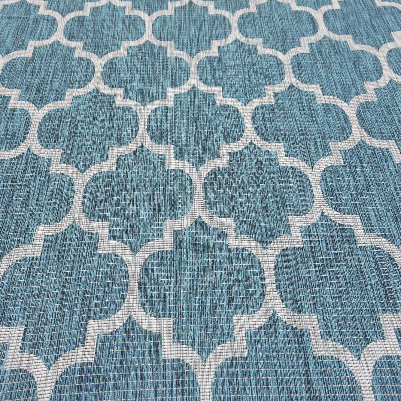 A repeating Moroccan trellis pattern in soft gray sits crisply against a teal field, giving this rug a clean, graphic look with a relaxed, woven character. The surface has a flat, low-profile weave with a subtle slub texture that adds visual depth and a linen-like appearance. Machine made from 100% polypropylene, the construction reads as tightly woven and smooth underfoot.