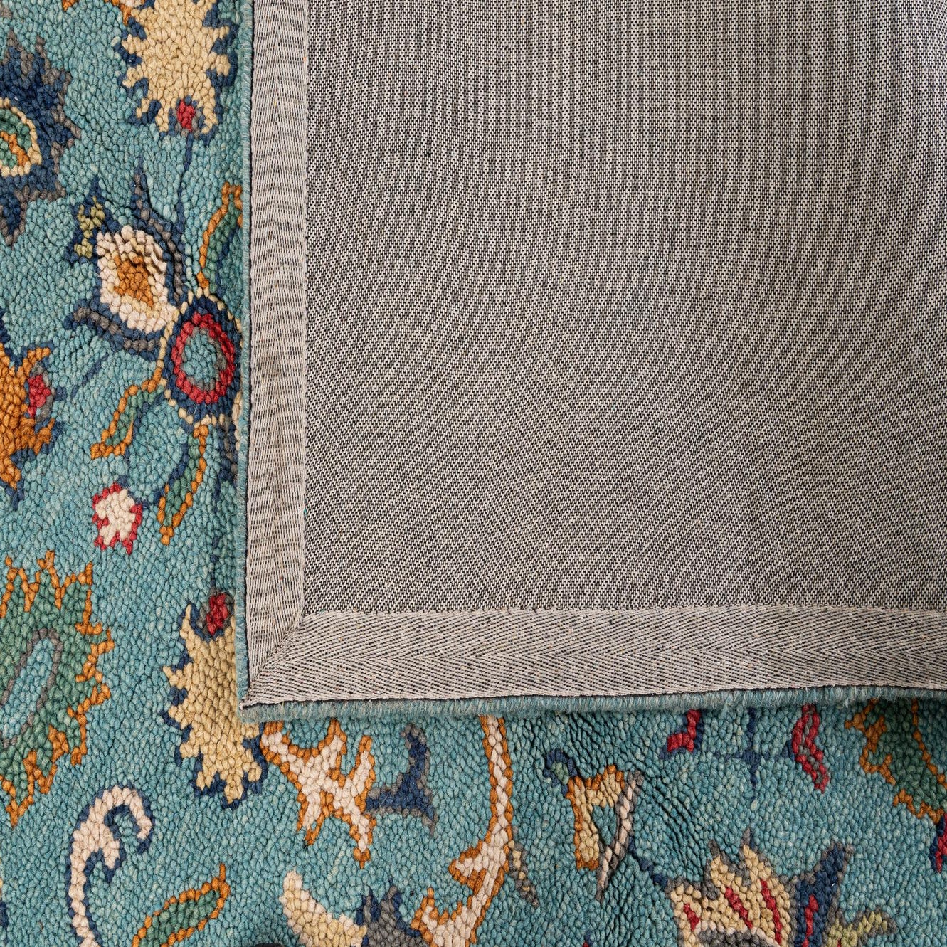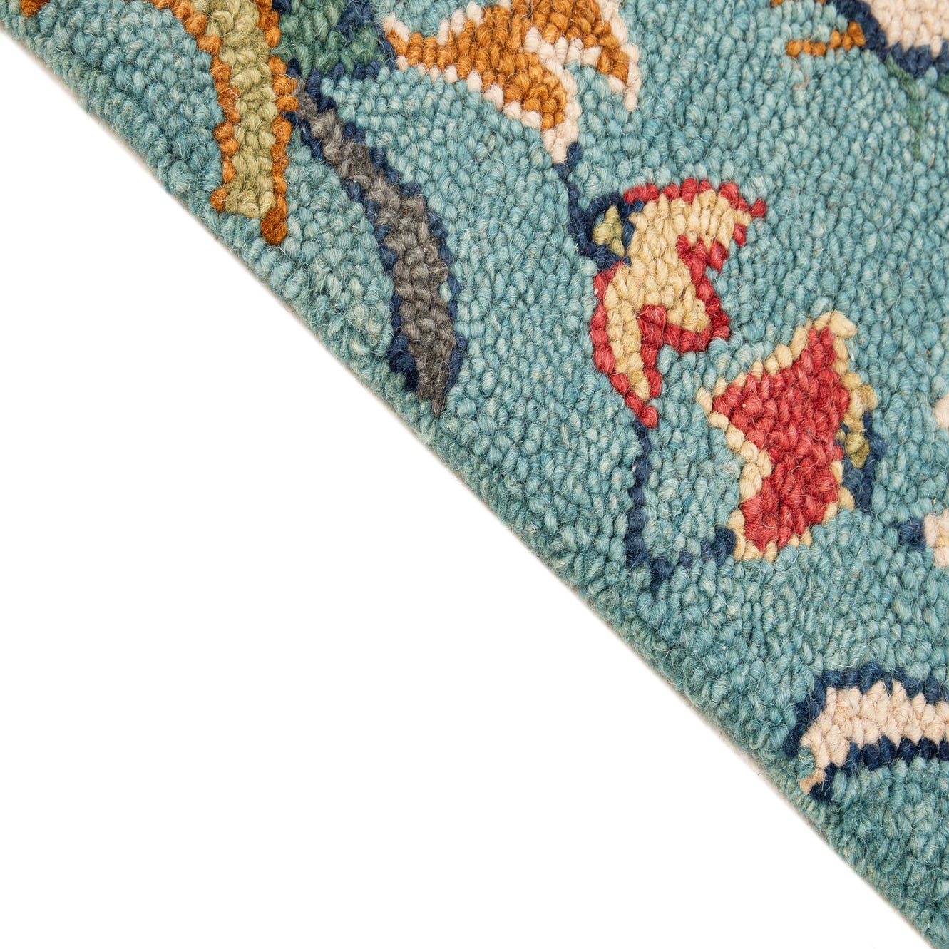 Primary color is Teal. Colors in this rug include: Teal, Beige, Black, Blue, Brown, Navy Blue, Yellow, Green, Ivory.