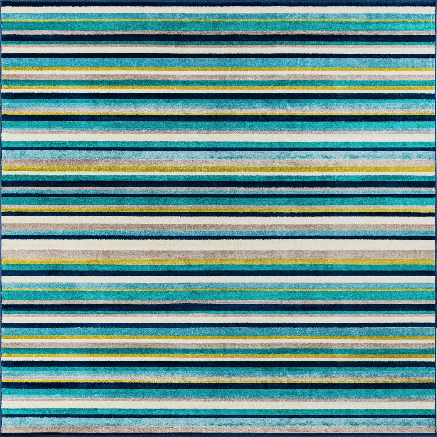 A teal field provides the backdrop for clean, horizontal stripes in varying widths—navy, light blue, ivory, gray and touches of green move across the surface in a rhythmic, contemporary pattern. Machine-made from 100% polypropylene, the rug has a low-profile cut pile with a soft, slightly lustrous feel underfoot and a consistent, dense texture that holds the stripe definition clearly. The color palette balances cool tones and neutrals: teal anchors the look, navy and light blue add depth, ivory and gray bring contrast, and green accents introduce a lively note.