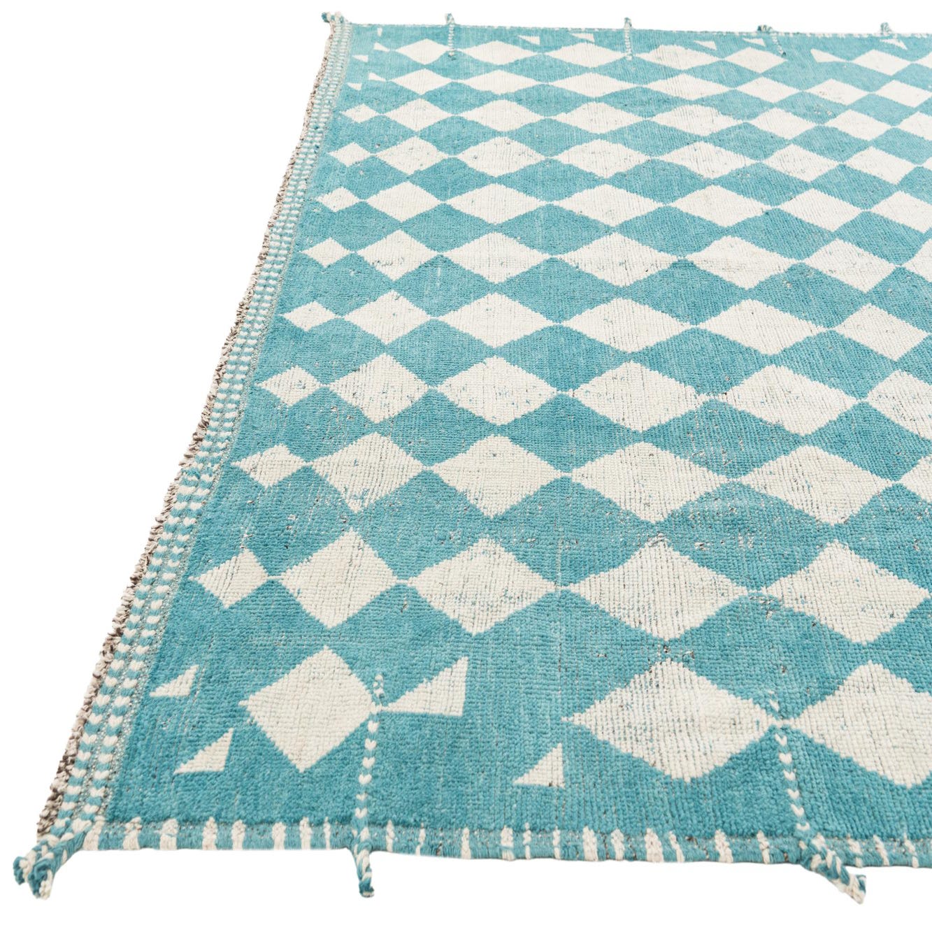 Hand-knotted from 100% wool, this rug pairs a bold teal field with an all-over ivory diamond motif for a modern take on traditional geometry. The diamonds have softly irregular edges and a slightly washed appearance that adds subtle texture and visual depth. Visible knotting and short fringes on the ends bring an artisanal touch, and the wool surface feels gently springy and tactile underfoot.