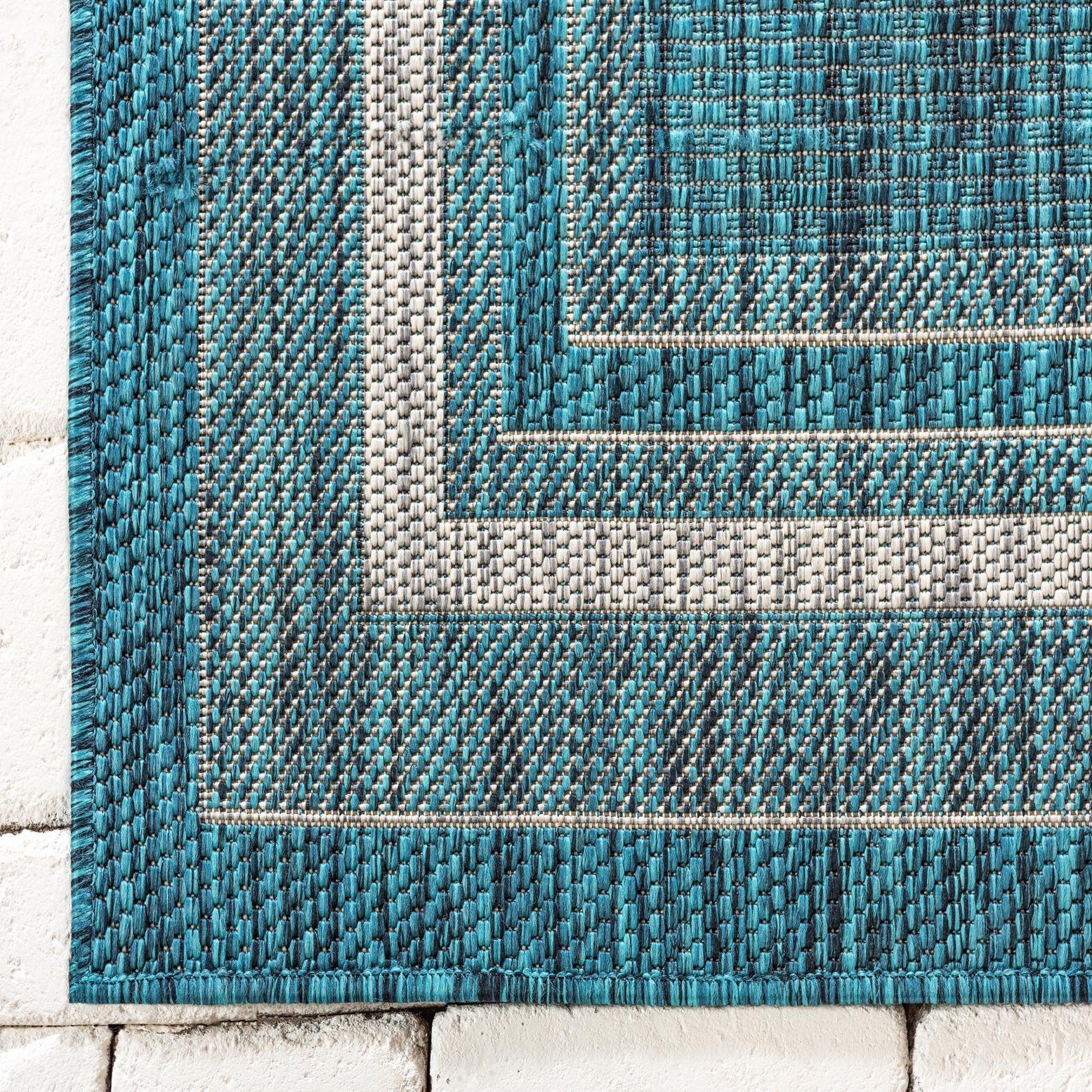 A 9x12 rectangular indoor/outdoor rug featuring a solid blue-green field with a light border, ideal for a patio or living room.