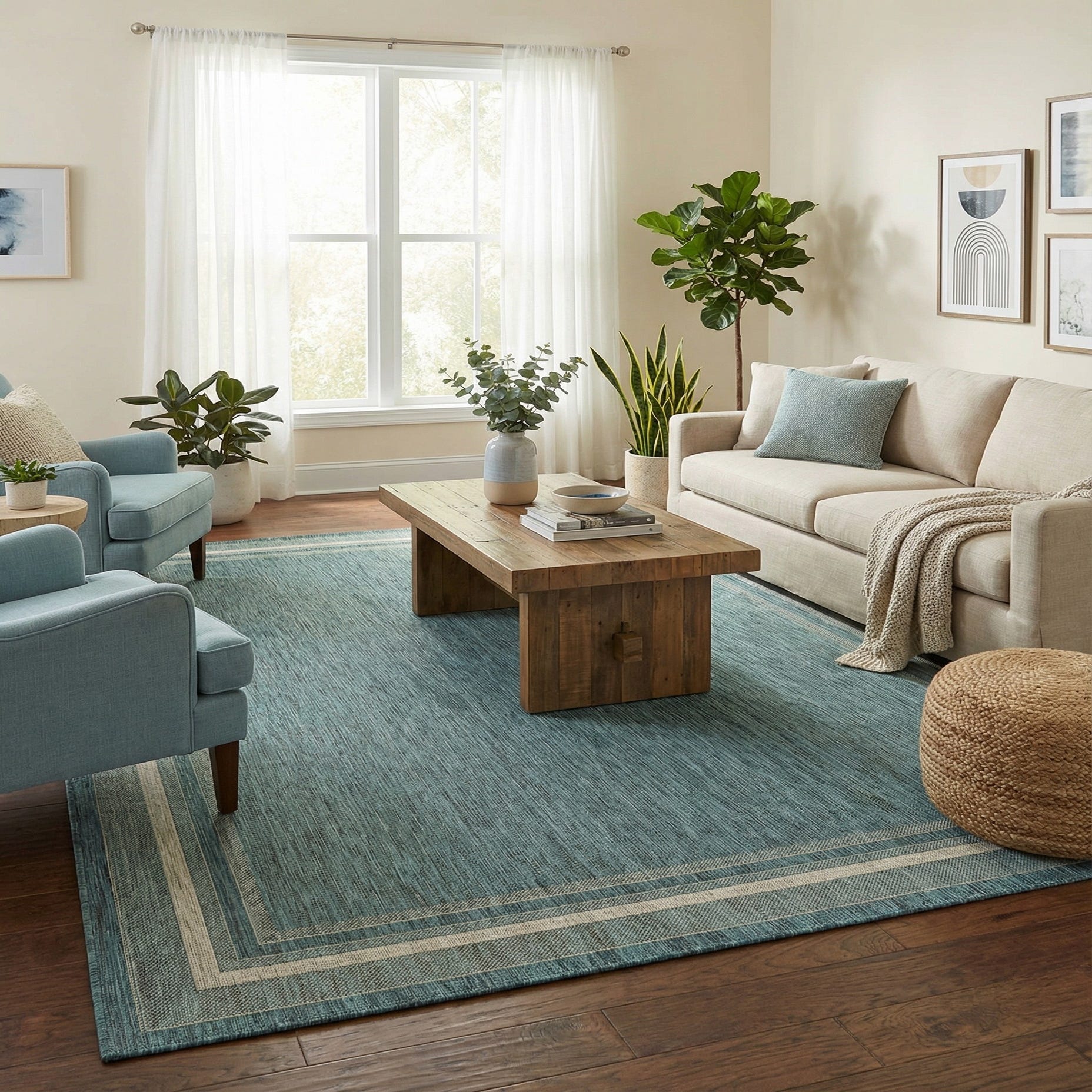 A 9x12 rectangular indoor/outdoor rug featuring a solid blue-green field with a light border, ideal for a patio or living room.