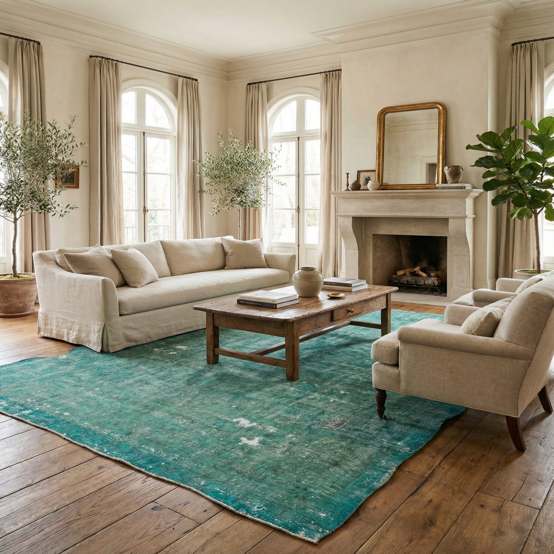 The Ultra Vintage Collection presents a hand-knotted 9x12 rug crafted from 100% wool, combining durability with a plush texture that invites touch. The rug boasts a dominant teal background interspersed with subtle accents in black, ivory, and touches of green, creating depth and visual interest within its understated pattern. The rug’s design evokes the allure of age, featuring slight intentional distressing that adds character and a narrative of timelessness to the piece.