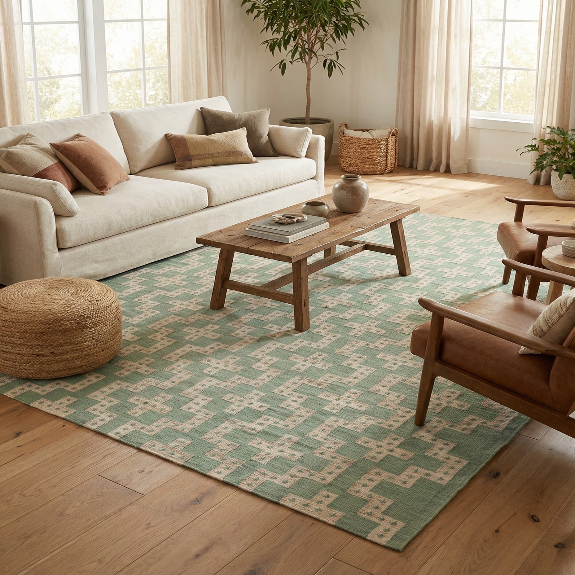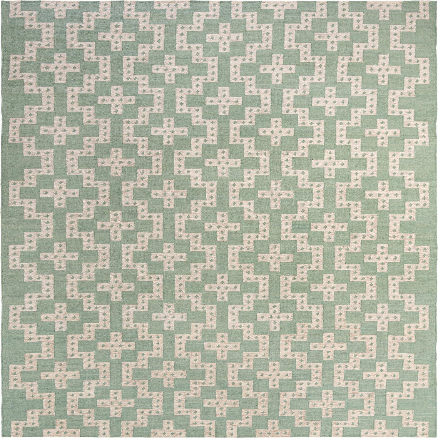A 10x14 rectangular Kilim Wool rug featuring a repeating tribal geometric pattern in light blue and cream.