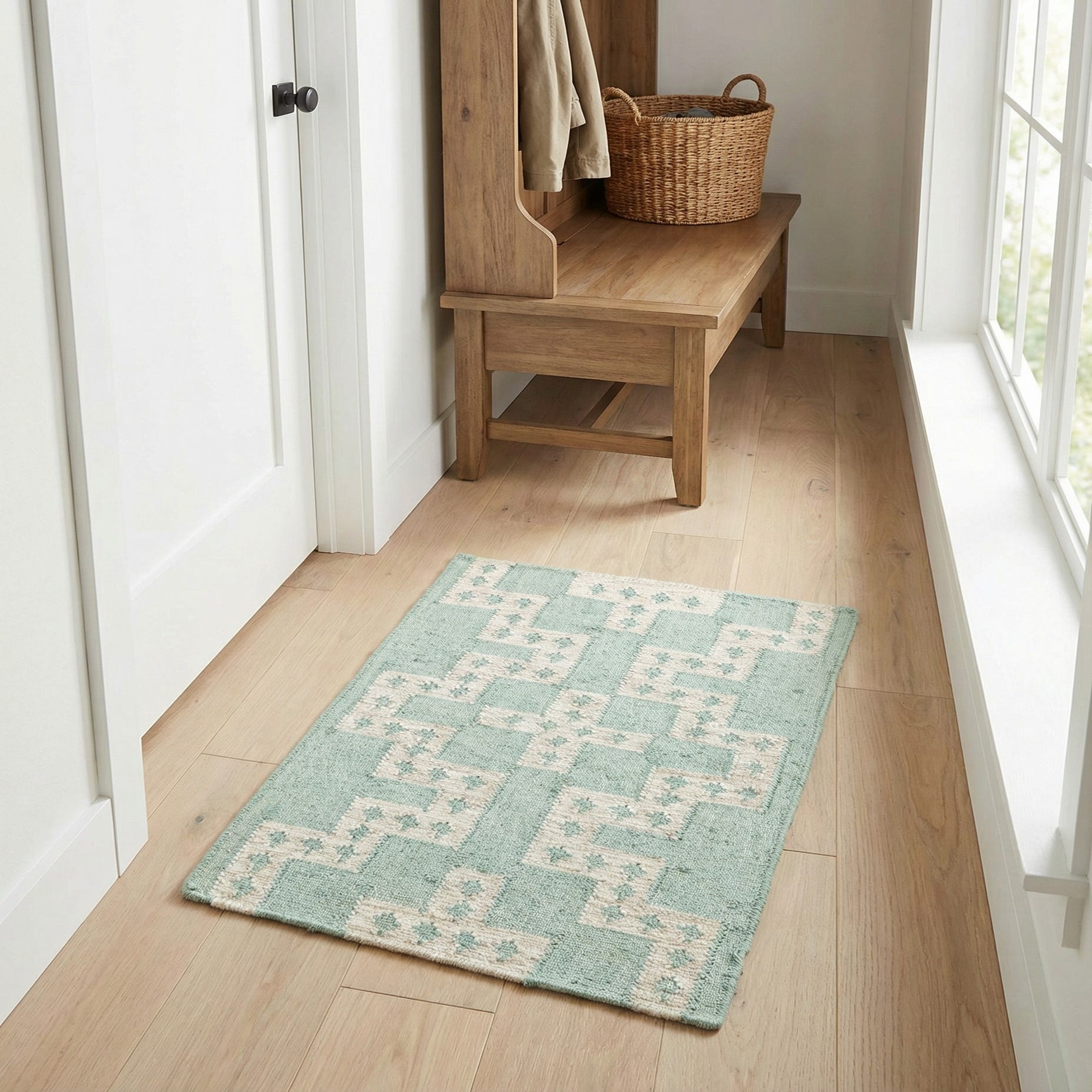 A 2x3 rectangular Kilim Wool rug featuring a modern tribal pattern in light blue and cream, perfect for an entryway.
