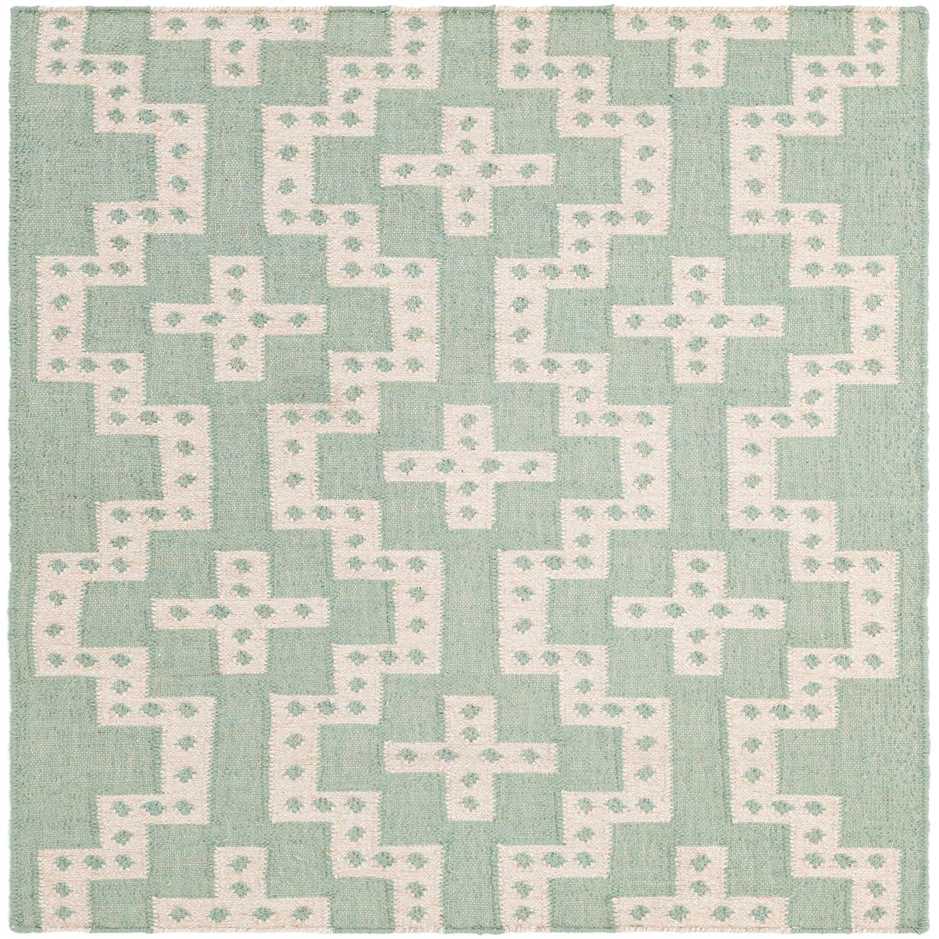 A 4x6 rectangular blue and cream flatweave wool rug with a repeating geometric tribal pattern, ideal for a living room.