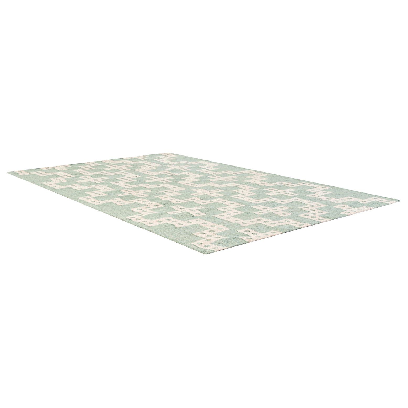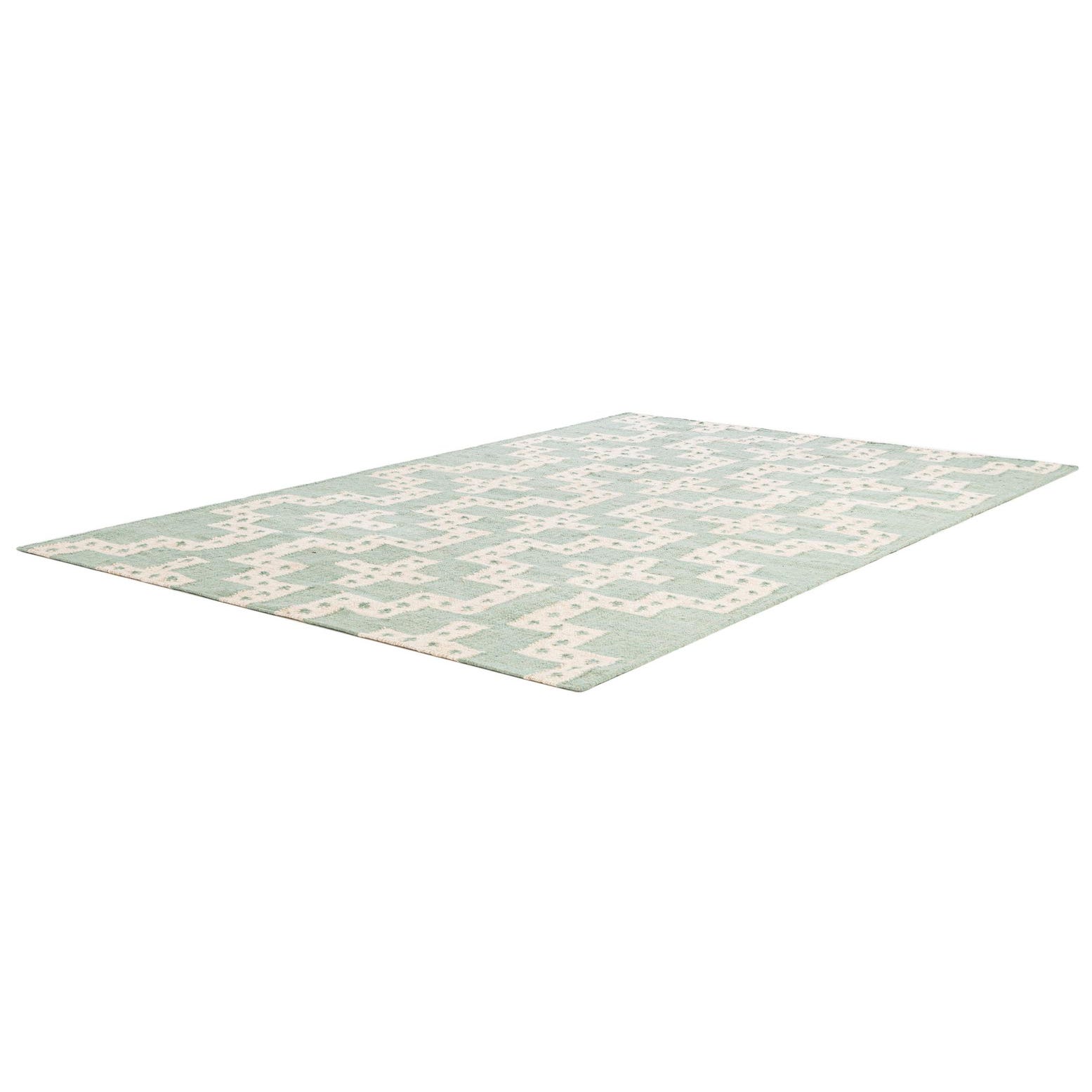 Warm teal and crisp white form a repeating geometric pattern of stepped crosses and small dotted accents, giving the rug a clean, graphic look with a handmade character. The flat, hand-woven construction in 100% wool has a low profile and a tactile, slightly nubby surface—soft to the touch but structured enough to define a room. The balanced contrast between the teal field and white motifs keeps the pattern visible without overpowering other elements in the space.