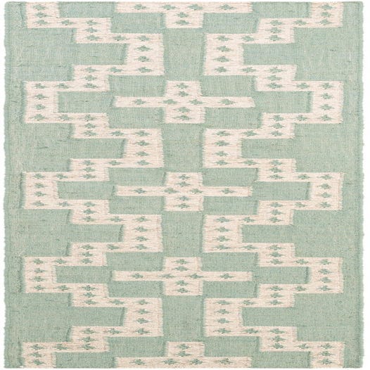 A close-up of an 8 ft runner rug featuring a tribal geometric pattern in light blue and cream, suitable for a hallway or kitchen.