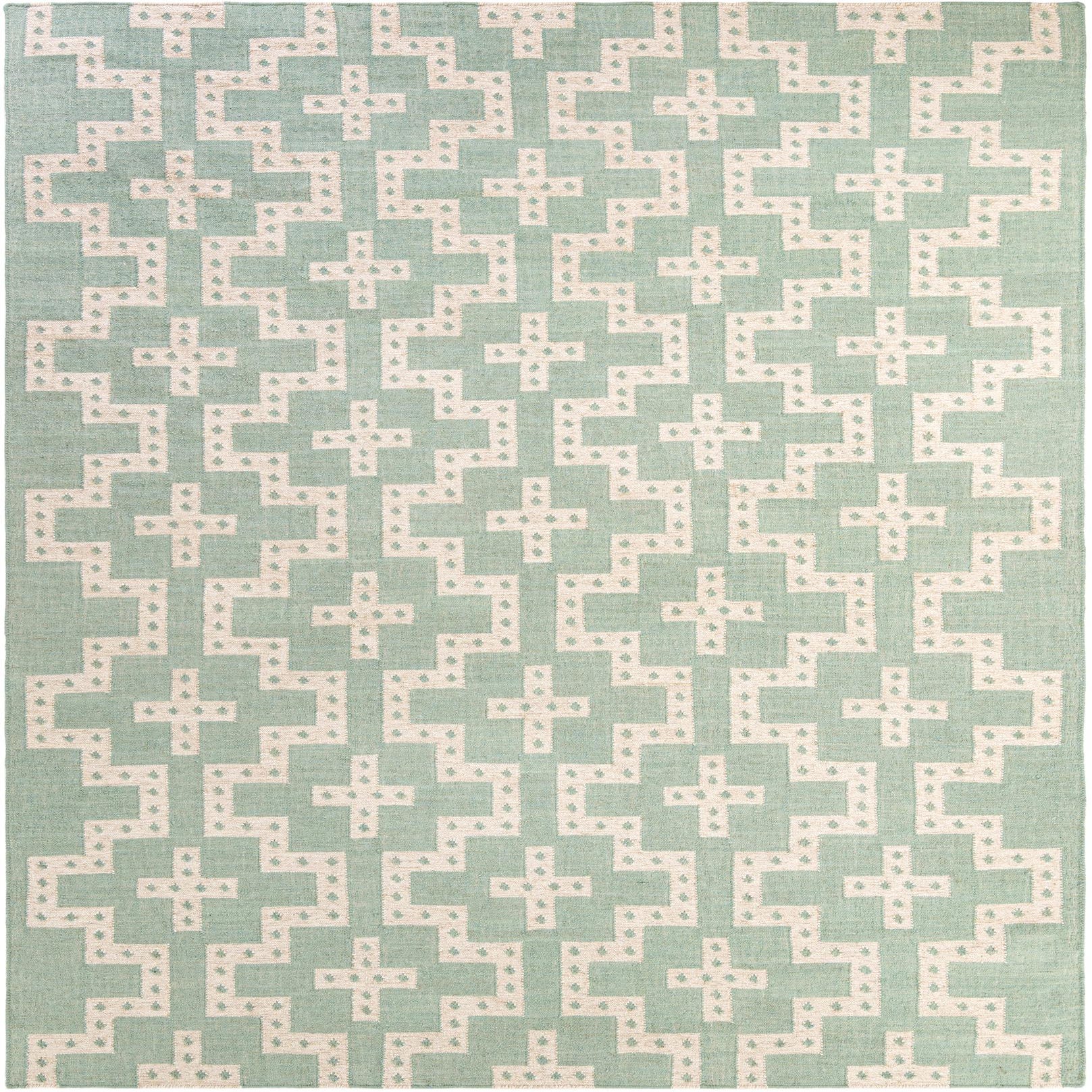 A 9x12 rectangular Kilim Wool rug in light blue with an off-white modern tribal geometric pattern and subtle texture.