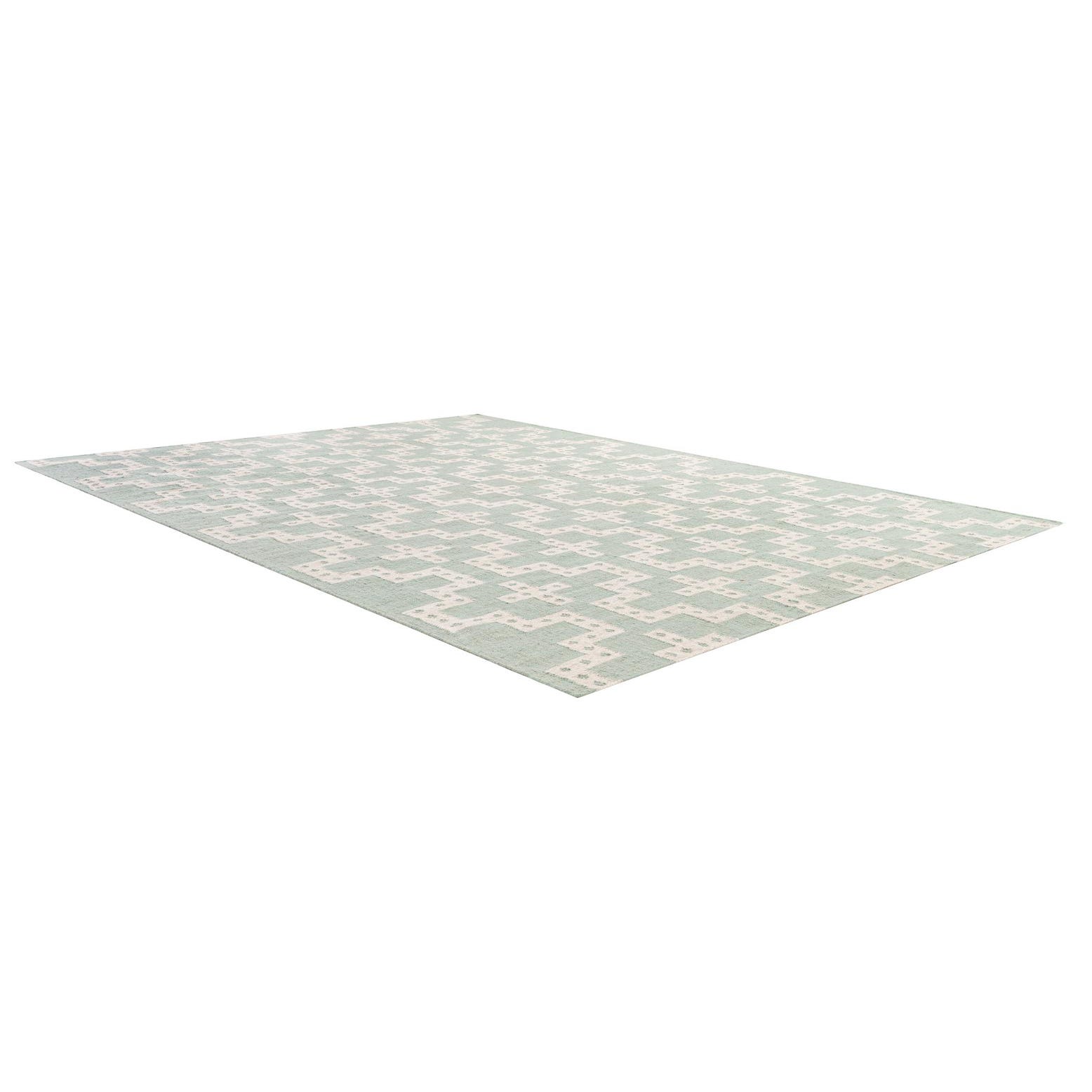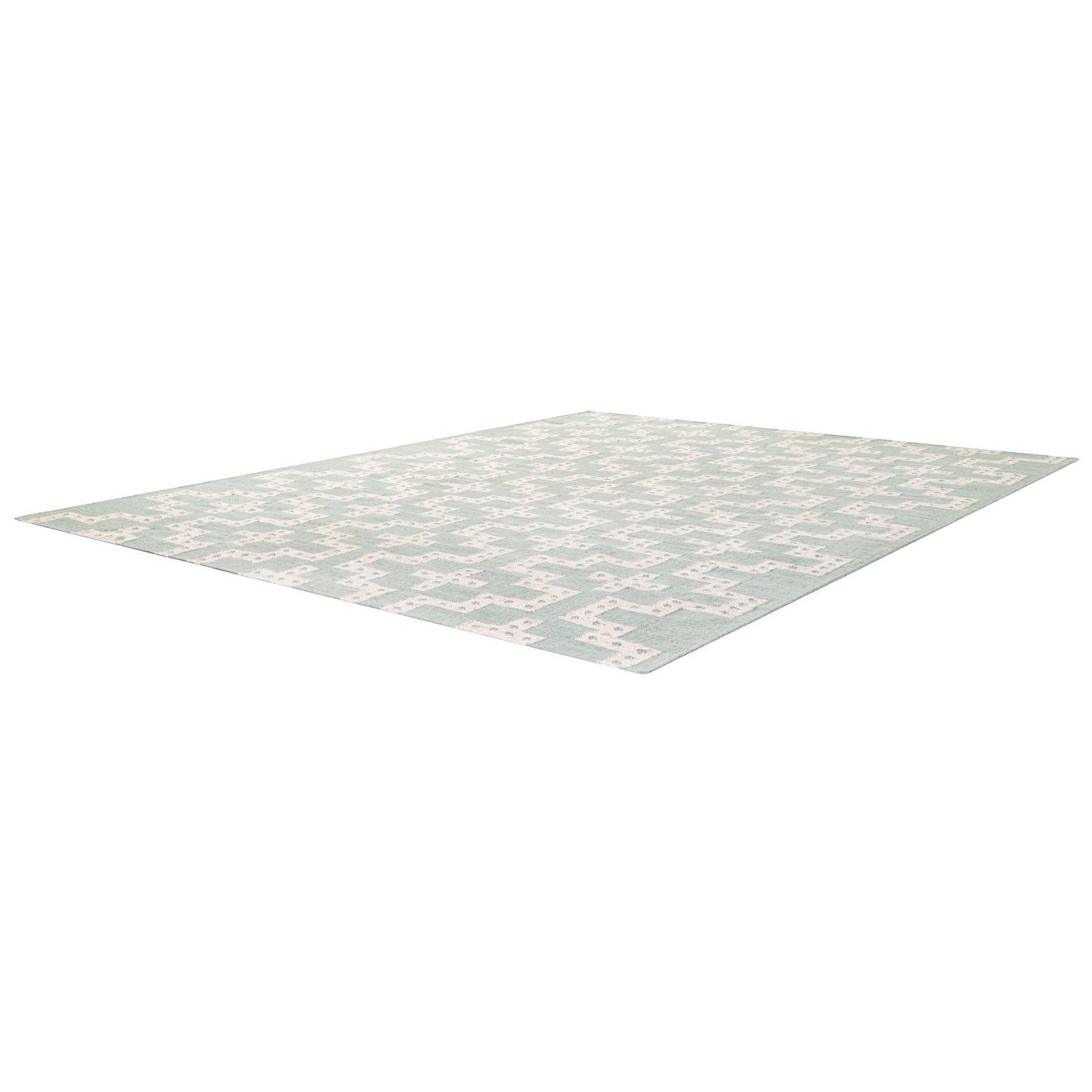 A 9x12 rectangular Kilim Wool rug in light blue with an off-white modern tribal geometric pattern and subtle texture.