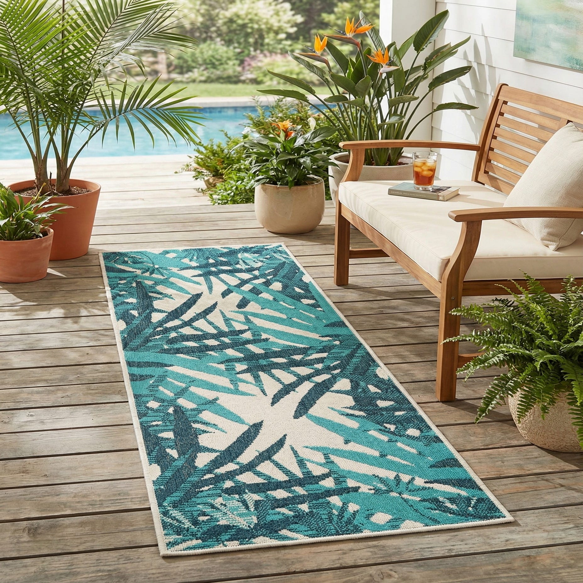 This runner works well in coastal, contemporary, or casual-modern interiors — think a sunlit entryway, a narrow kitchen aisle, or a breezy sunroom. Pair it with light wood floors, rattan or wicker seating, and navy or ivory textiles for a cohesive palette, or use it to inject color down a hallway alongside neutral furnishings. Its construction makes it a practical decorative anchor in high-traffic spaces where lasting color and clear pattern matter.