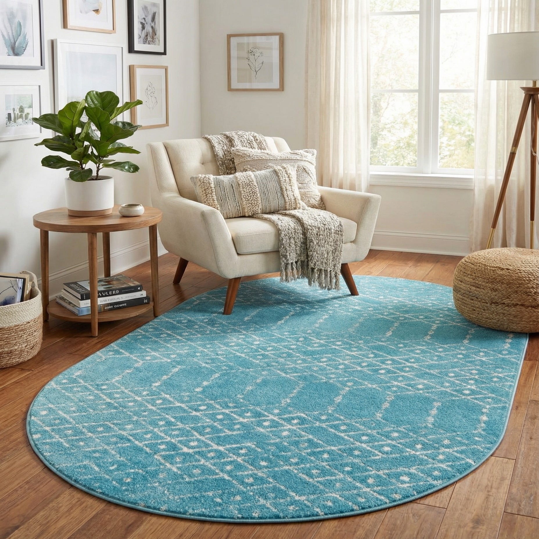 The oval silhouette makes this piece well suited to small seating nooks, beneath a round or oval dining table, or layered in a bedroom to soften straight lines. It pairs naturally with light woods, linen upholstery, and coastal or contemporary color palettes—think whitewashed furniture, rattan accents, or simple navy and sand tones for a fresh, relaxed atmosphere.