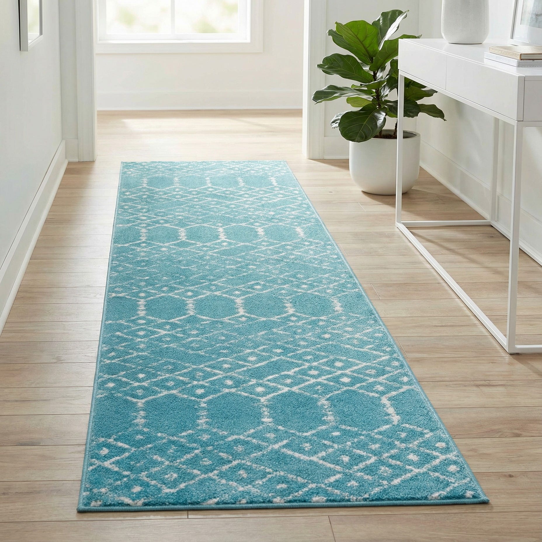 A crisp ivory trellis pattern runs across a teal blue background, forming repeating diamonds and elongated ovals that give the runner a modern, geometric rhythm. The ivory motif sits slightly raised against the teal ground, creating a subtle contrast that draws the eye without dominating a space. The pile feels soft and low-profile underfoot, with a dense, cushioned surface that balances comfort and defined pattern.