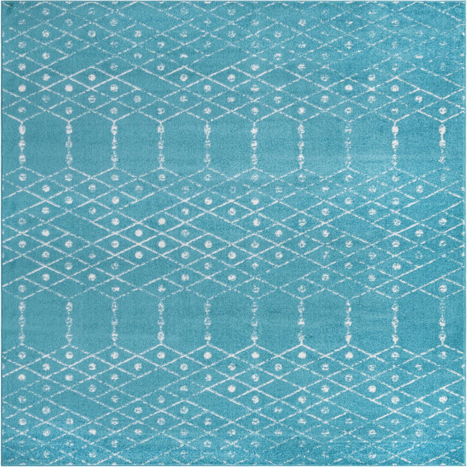 A rectangular 8x10 teal blue area rug with a modern tribal trellis pattern in white, suitable for a living room.