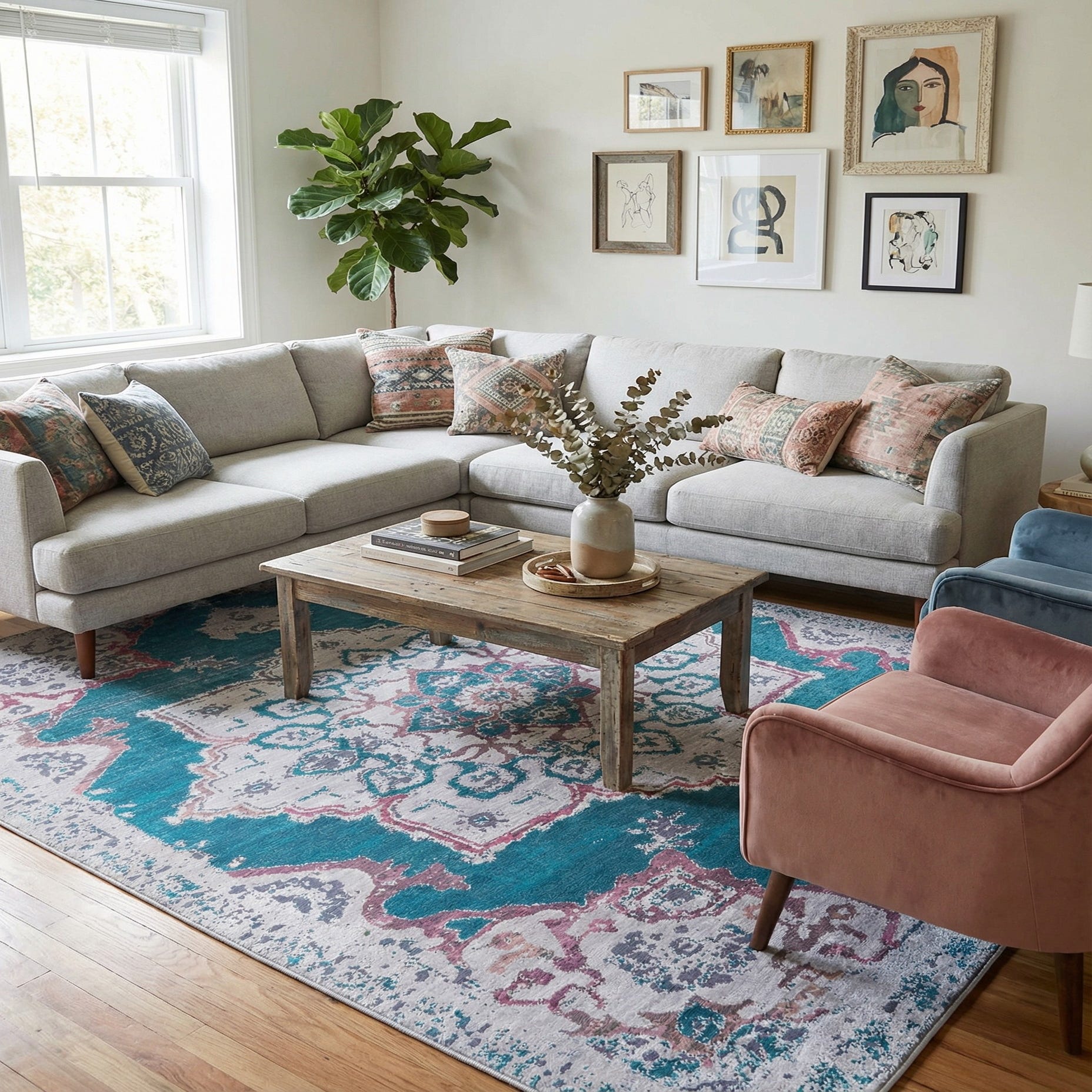 This piece works well as an anchor for a living room seating group, a colorful layer beneath a neutral dining table, or a focal point in a bedroom where textured textiles soften the space. Pair it with light wood or mid-century furniture for a modern-retro look, combine it with woven textiles and mixed patterns for a relaxed bohemian scheme, or use it to inject color into a contemporary neutral palette. The consistent machine-made weave and chenille surface make it easy to place under furniture and enjoy as a daily-use statement.