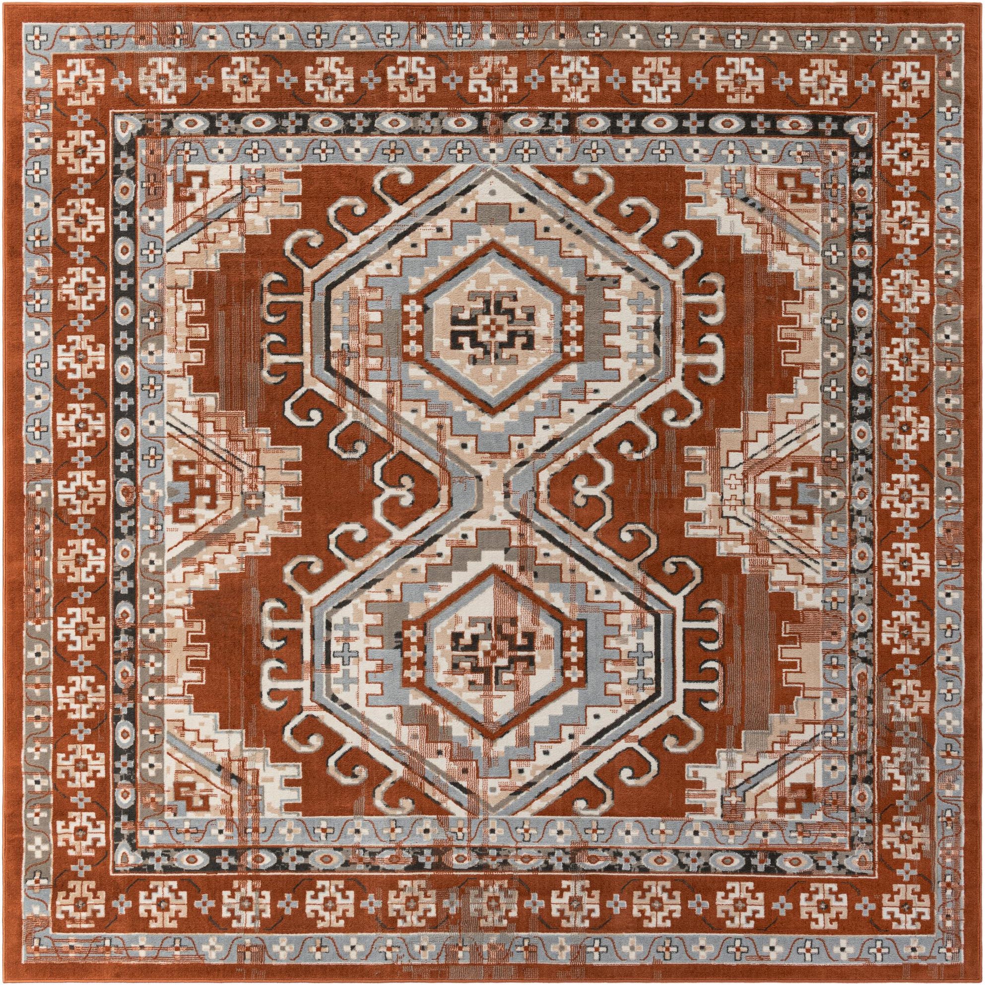 A 10' square Charlotte Southwestern rug in shades of orange, red, grey, and cream, featuring a tribal geometric pattern.