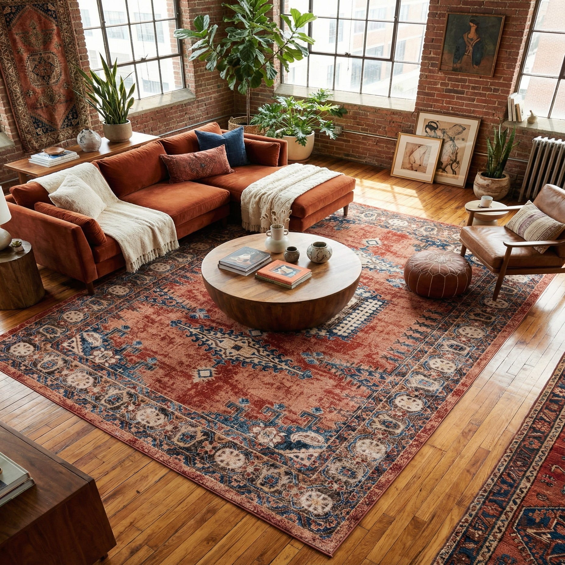 Machine made of 100% polypropylene, the construction balances a soft underfoot texture with enough structure to hold pattern and color in active areas of the home. This palette works beautifully with warm wood tones and leather seating in a living room, layered into a bohemian or eclectic scheme with woven throws and mixed textiles, or paired with classic upholstered pieces in a transitional dining or bedroom setting to add depth and color. The rug’s terracotta ground and blue highlights also complement neutral walls or deep navy accents for a grounded, welcoming atmosphere.