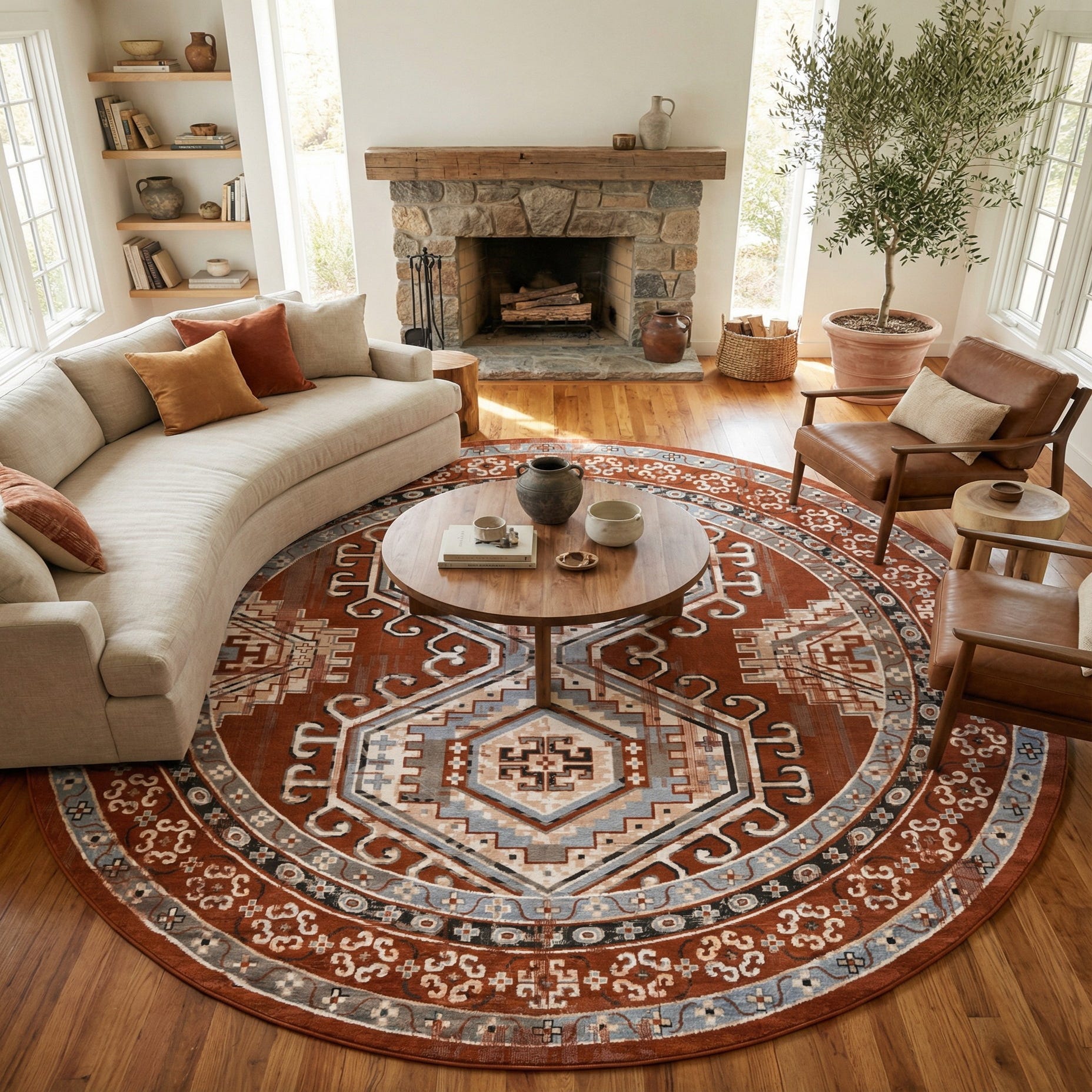 A warm terracotta field sets the tone for this round area rug, anchored by twin hexagonal medallions and stepped geometric motifs that give the piece a modern-tribal look. Scrolling accents and multiple concentric borders of small repeating symbols add layered interest, while light blue, gray, and ivory highlights provide crisp contrast against the rich background. The low-pile 100% polypropylene surface has a soft, smooth hand with a subtle sheen and gentle texture that feels comfortable underfoot.