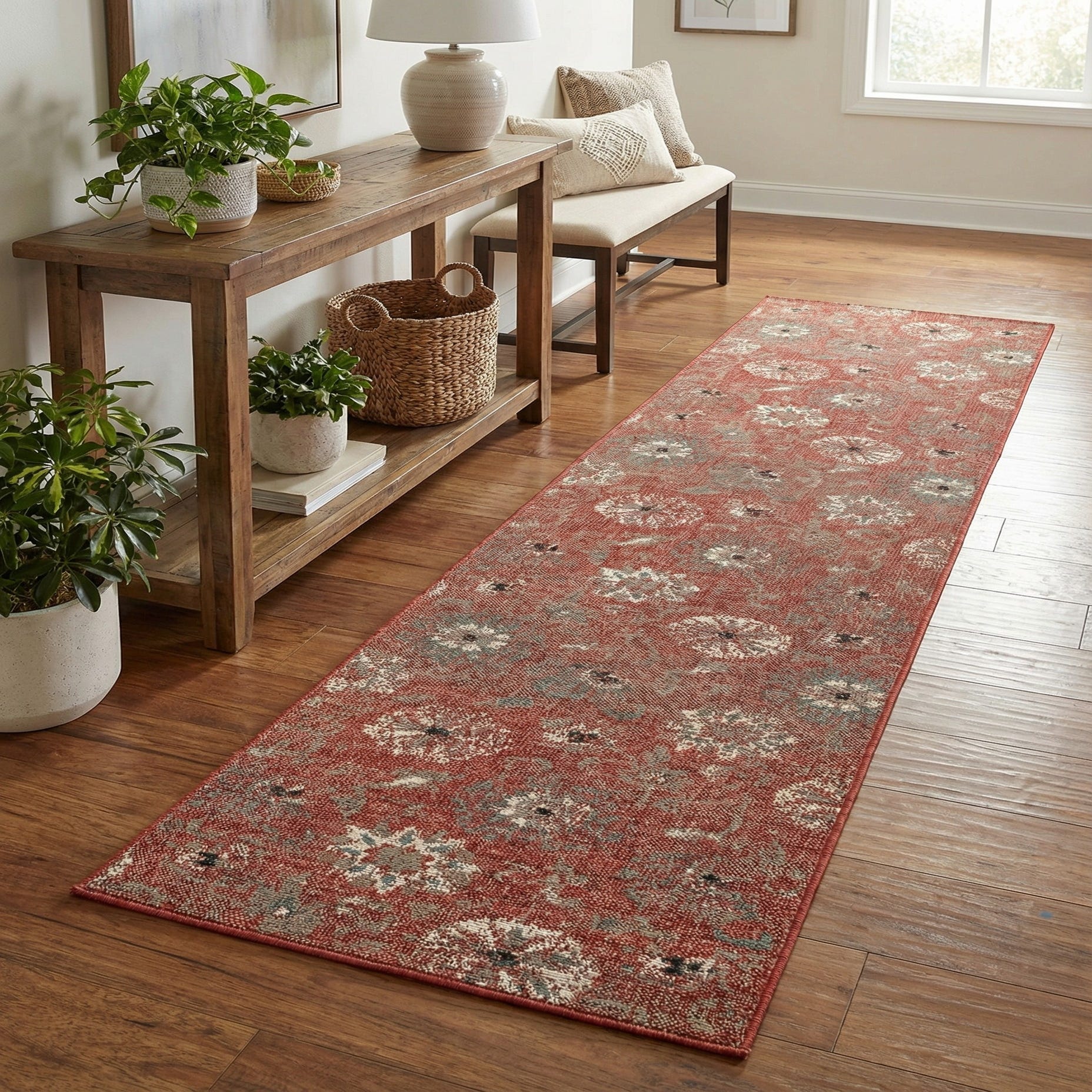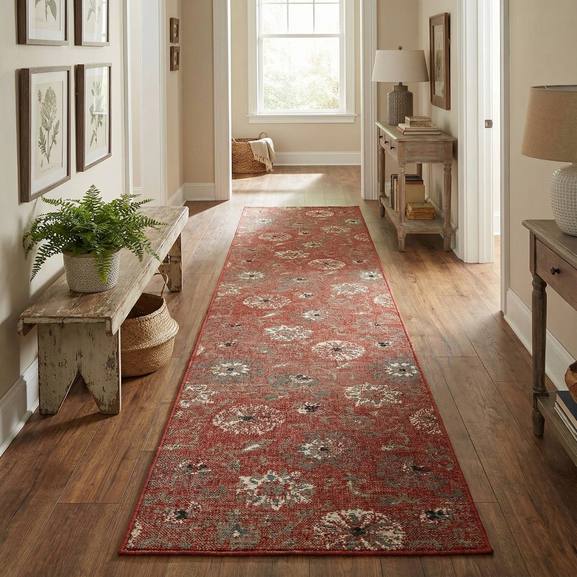 A 12 ft runner rug with a modern floral pattern in shades of orange, red, and muted teal, suitable for a hallway or patio.