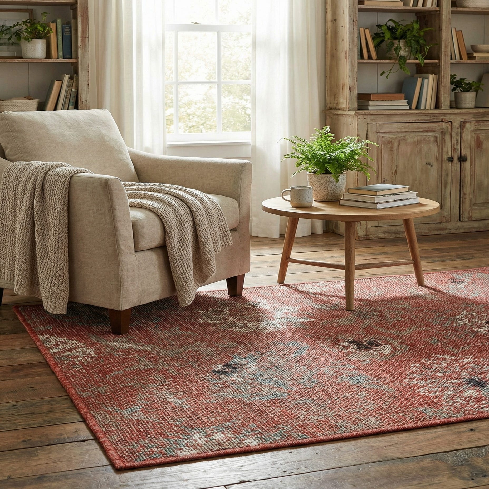 A warm terracotta field sets the stage for this machine-made, 100% polypropylene outdoor botanical rug. The low-profile, tightly woven surface has a slightly textured, looped feel that’s comfortable underfoot while holding its shape. Soft ivory and beige floral clusters and leafy motifs float across the background, punctuated by subtle blue highlights and small black centers that add depth and contrast. The overall effect is a vintage-inspired botanical pattern with a relaxed, lived-in character.