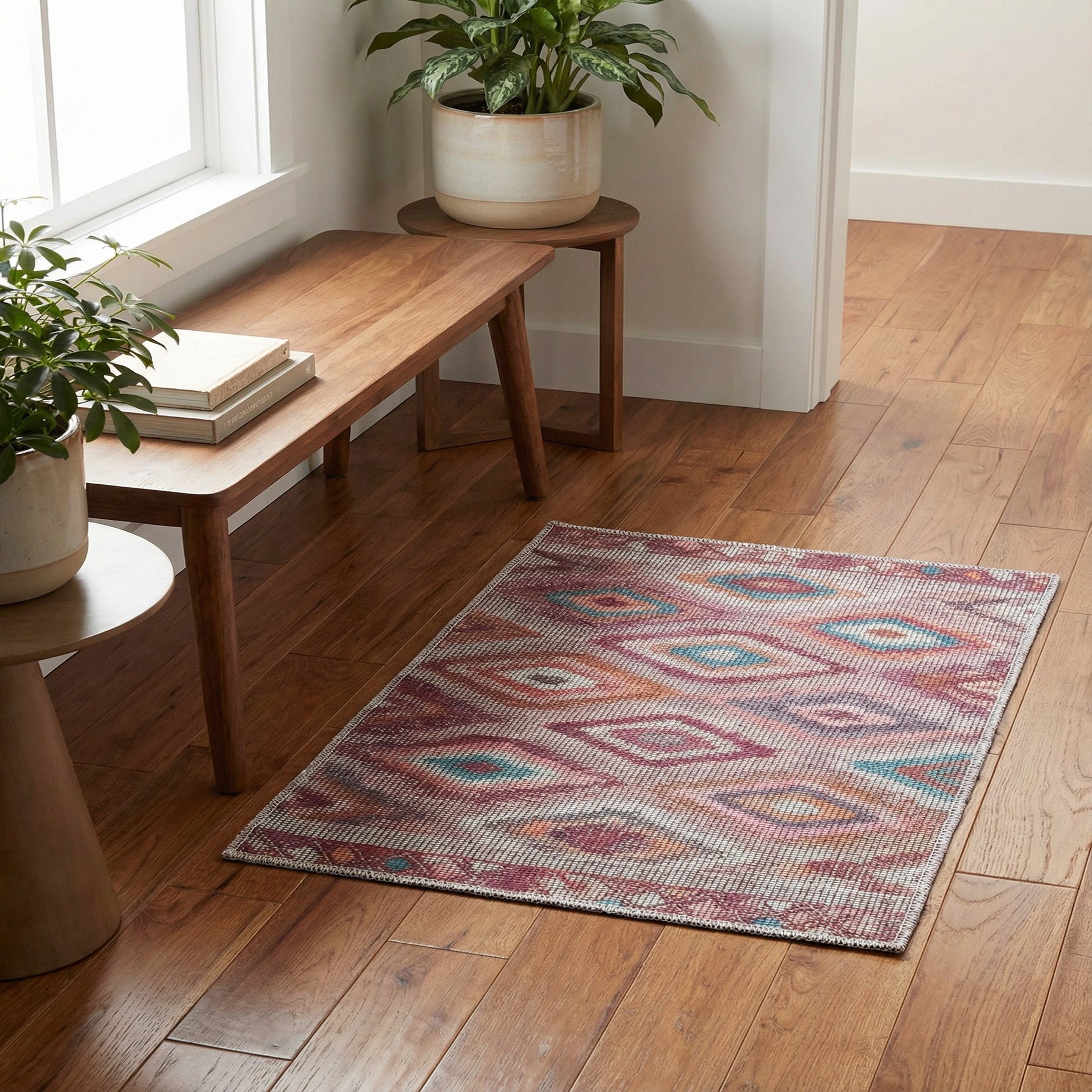Stain-resistant and designed to be pet-friendly, this rug is an excellent choice for homes that value both style and practicality. Machine washable and shed-free properties ensure ease of care and lasting beauty. With its vibrant colors and distinctive design, this rug can seamlessly integrate into various interior settings such as a modern urban loft, a bohemian-chic space, or an eclectic living area where a pop of color and a hint of vintage appeal are desired.