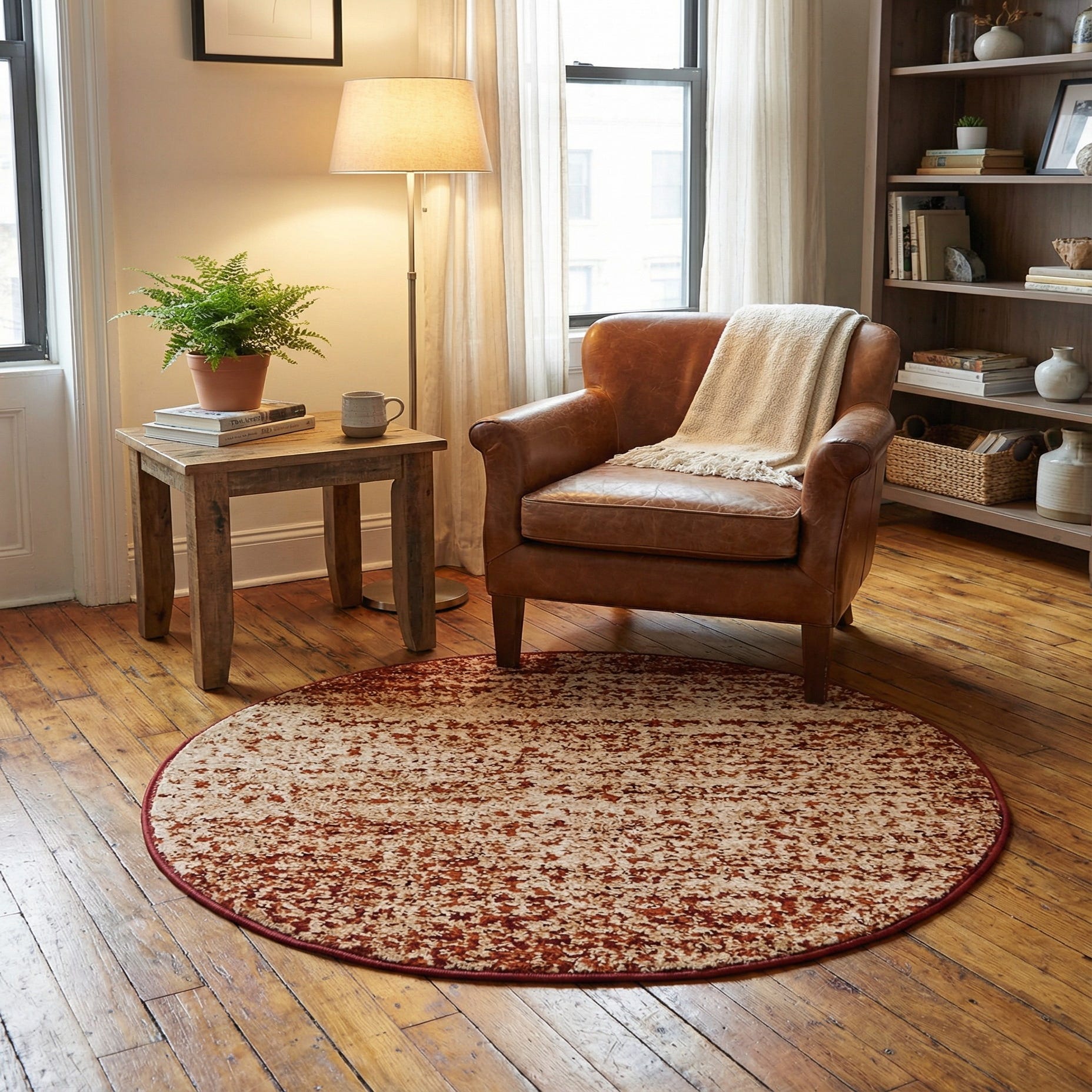 The rug's color scheme and stain-resistant properties make it a versatile addition to various interior settings. It could complement an earth-toned palette, where its terracotta hue would resonate with natural wood finishes and furnishings with warm undertones. Alternatively, the rug could serve as a grounding element within a more eclectic decor, harmonizing with both traditional and contemporary styles while providing a subtle hint of color. This piece is particularly well-suited for spaces such as living rooms, small sitting areas, or under a bistro table, where its round shape can soften the geometry of the room and add a touch of warmth.