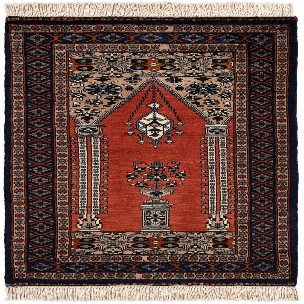 A 3x4 rectangular Bokhara rug featuring a central medallion and tribal patterns in rich oranges, reds, and navy blue.