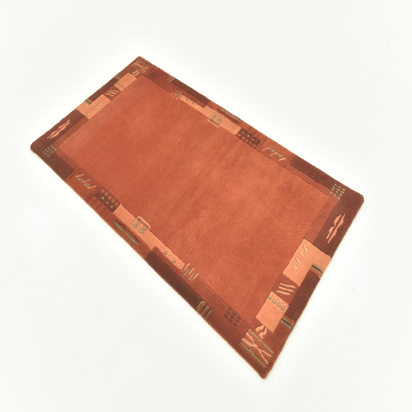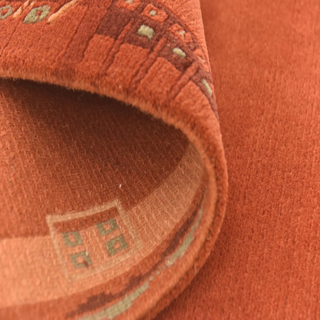The Nepal collection presents a distinctive 3x4 hand-knotted rug crafted from 100% wool, offering a durable and textured foundation for a variety of interiors. This piece features a rich terracotta background color, bordered by an artful assembly of geometric shapes and linear motifs in a complementary palette including burgundy, peach, and gray. The border's intricate design provides a tasteful contrast to the solid field, creating a visual frame that draws the eye towards the center of the rug.