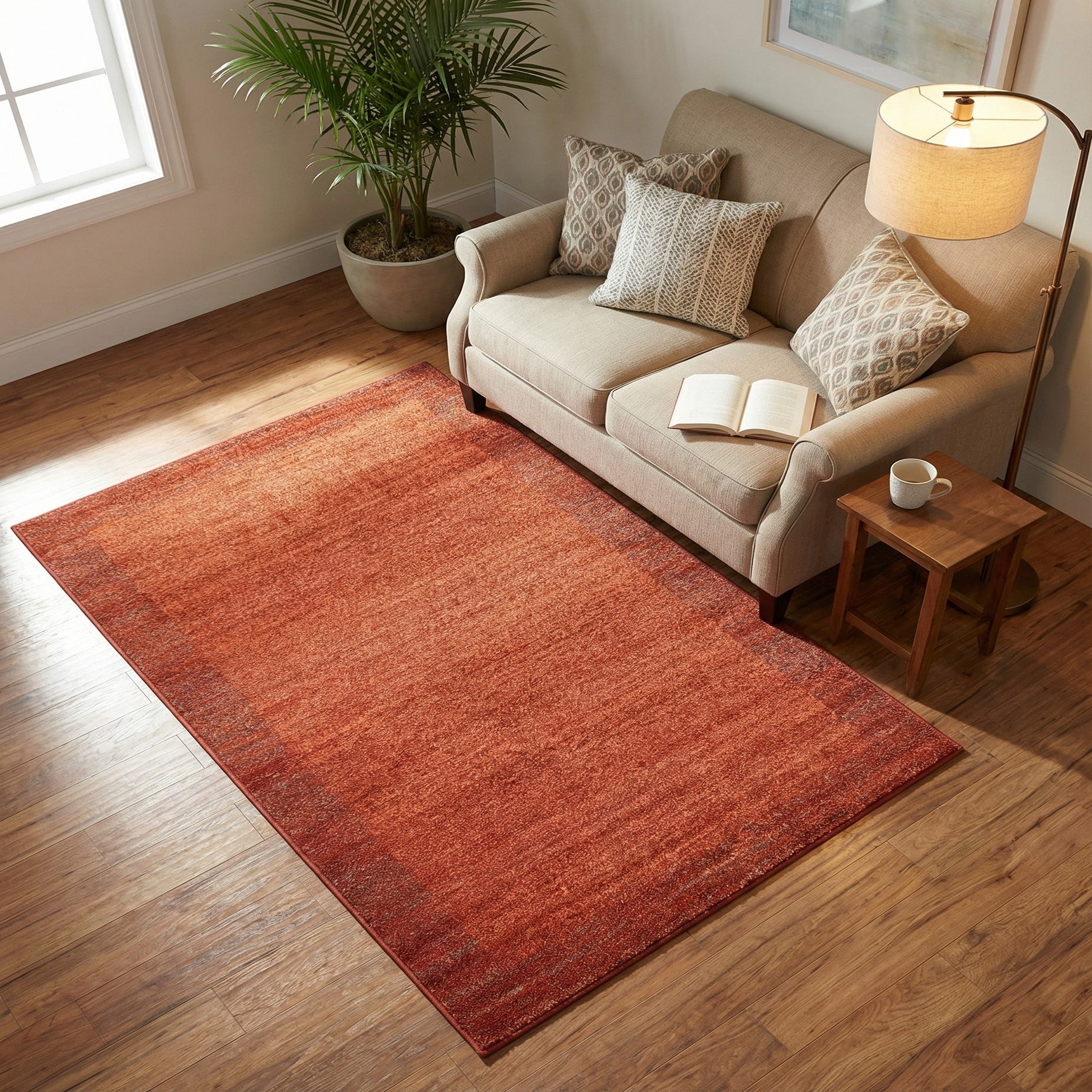 Warm terracotta provides the foundation for this rug, with rich red highlights woven throughout to create a quietly layered look. The pattern is intentionally simple: a broad, tonal field framed by a narrow, deeper-red border that adds dimension without competing with other elements in the room. The low-profile pile has a smooth, slightly lustrous surface you can feel beneath your feet, offering a restrained texture that complements both modern and transitional schemes.