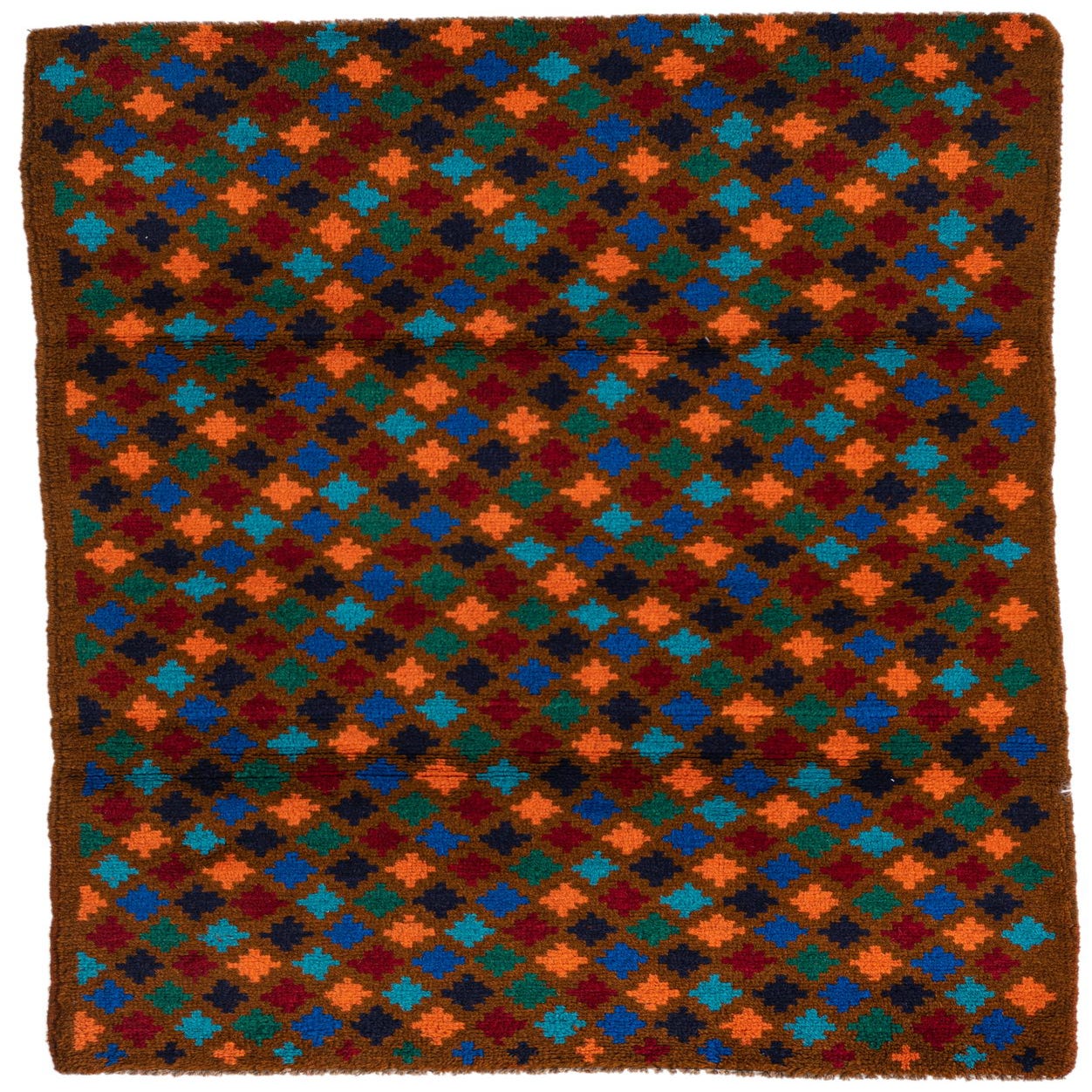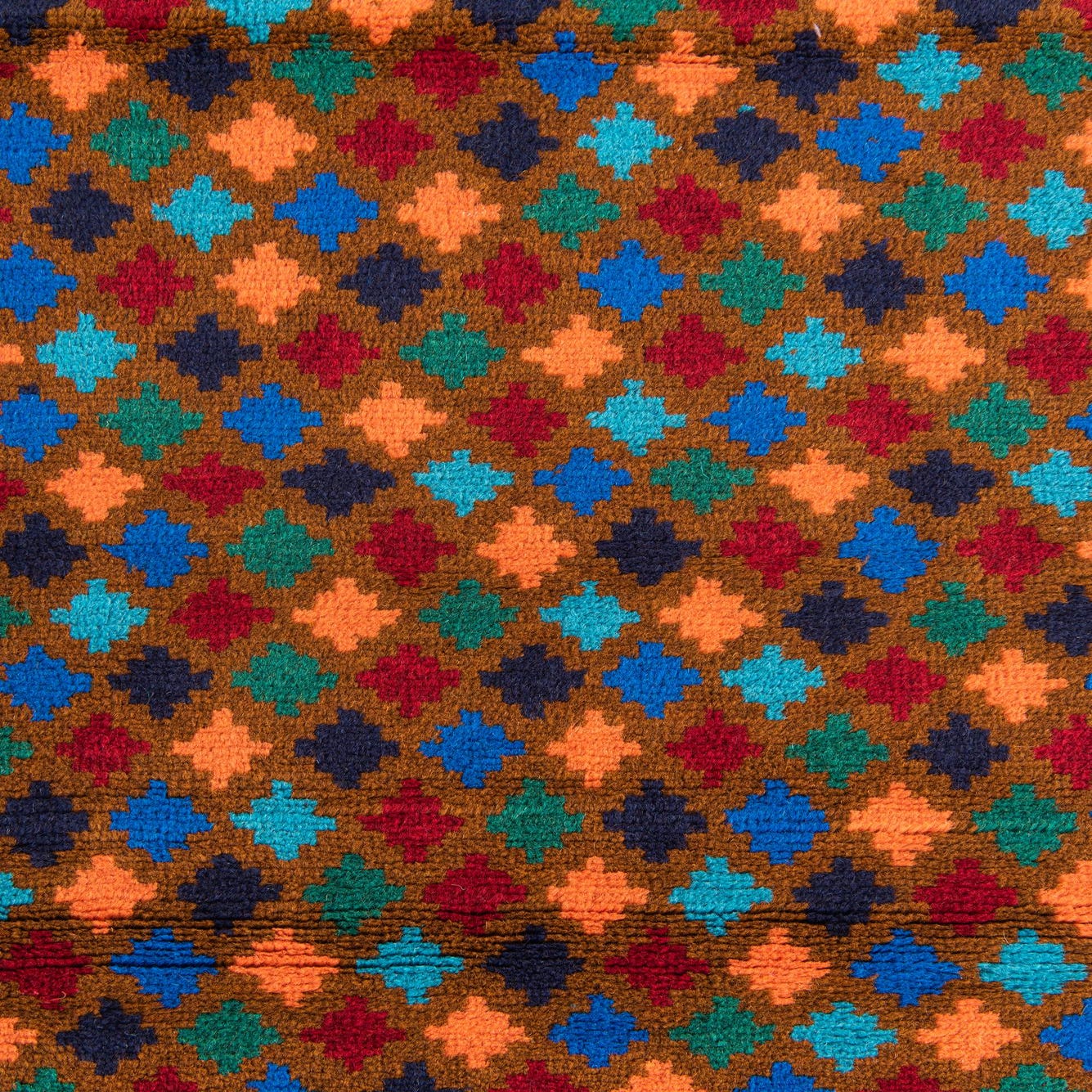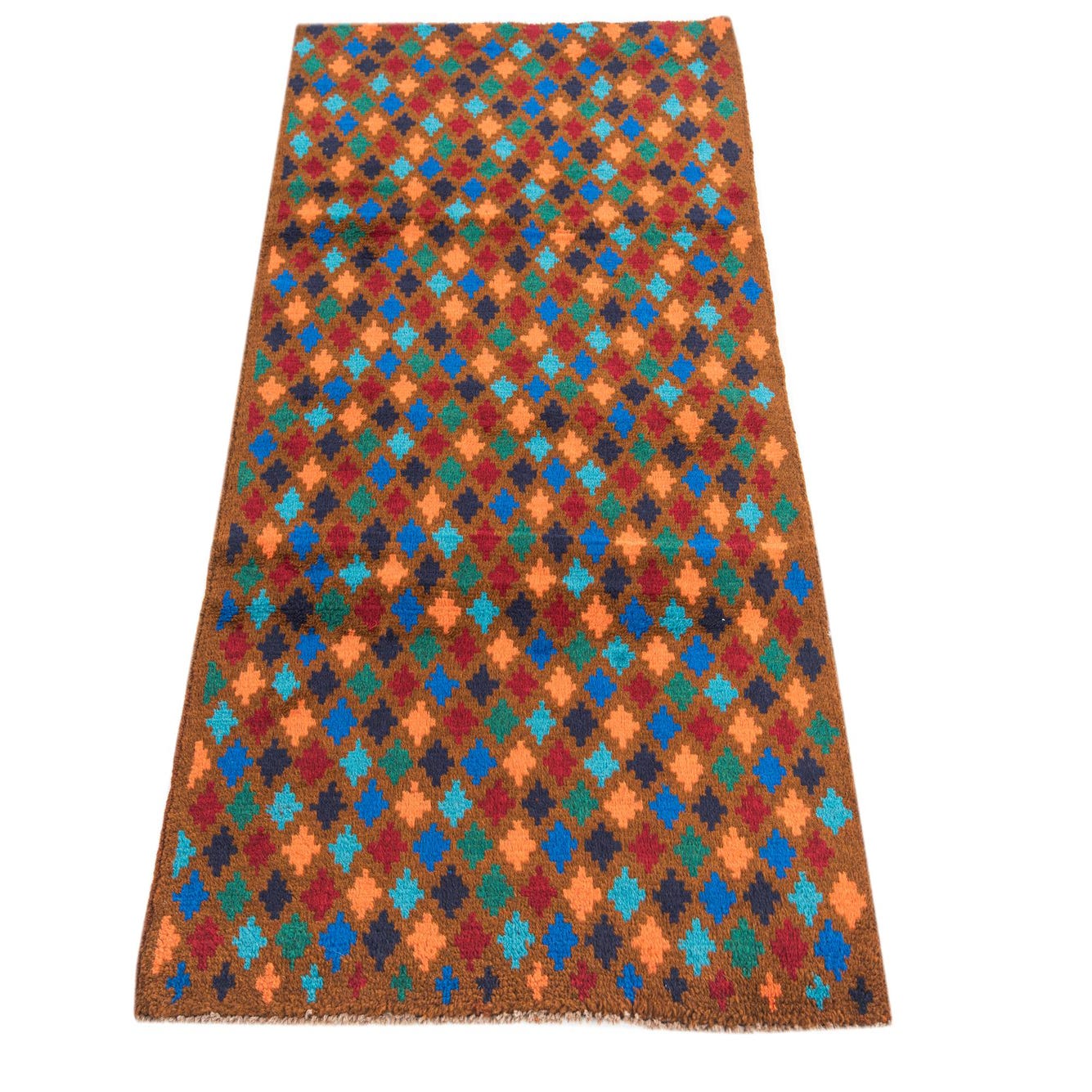 A 3x5 rectangular Balouch wool rug featuring a traditional tribal pattern of colorful diamonds in oranges, reds, blues, and greens on a brown background.