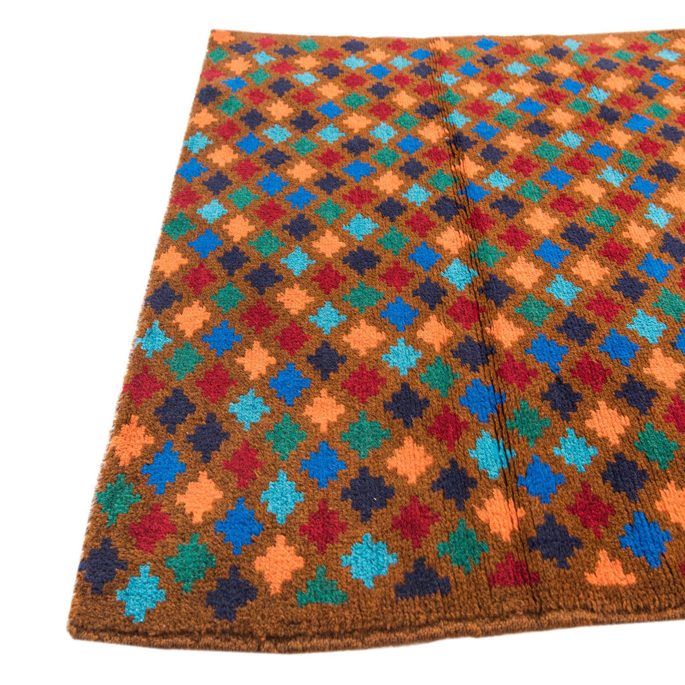 Hand-knotted in 100% wool, the rug has a dense, low-to-medium pile that feels springy and textured underhand; the knots read through the surface, lending crisp definition to each colored motif. Its color palette and scale work well in compact interiors: use it to anchor a small seating nook or reading chair, brighten an entry or hallway, or layer it over a larger neutral carpet to introduce pattern and warmth. The rug pairs naturally with warm wood tones, leather upholstery, deep navy fabrics, or mixed-metal accents for an eclectic, collected look.