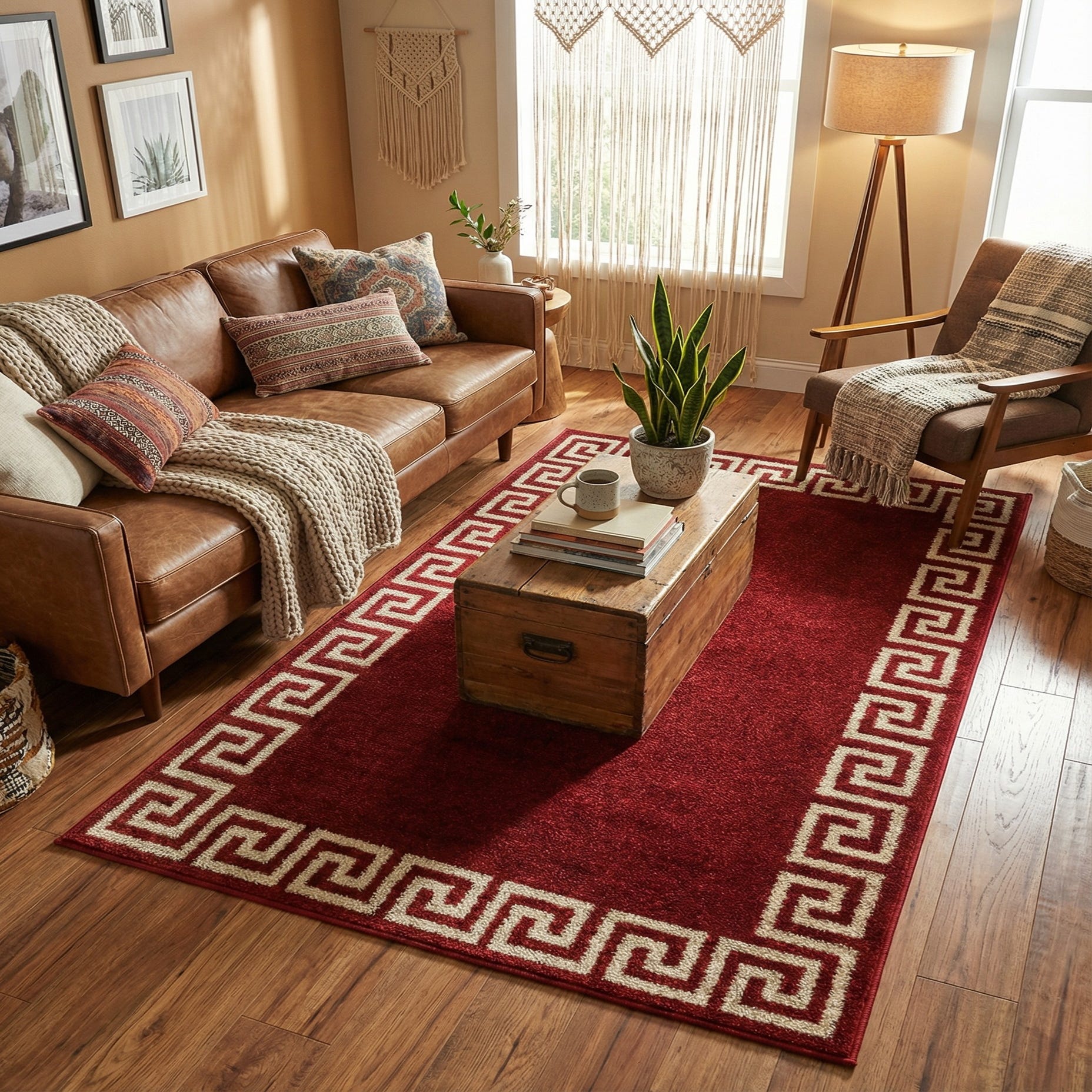 The warm terracotta and neutral beige pair easily with warm woods, leather seating, and brass or matte-black accents. Ideal for an entry or hallway, it also works well layered in a living room, placed at the foot of a bed, or used to define a cozy reading nook. The bold border provides structure for both Mediterranean-leaning interiors and more contemporary or transitional rooms that benefit from a strong, simple statement.