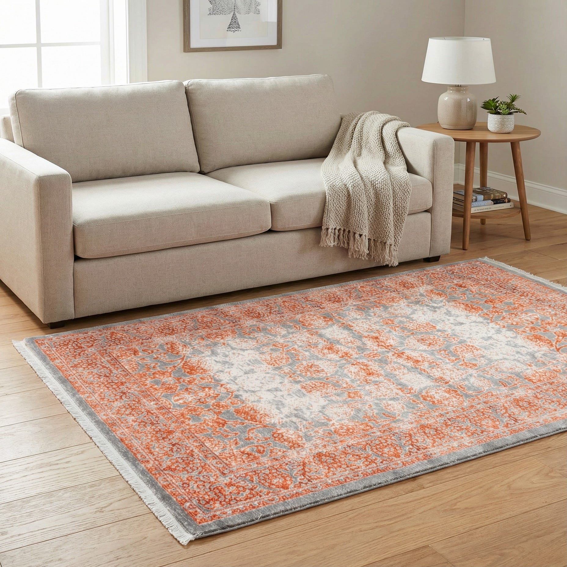 A classical floral-and-medallion motif is given a modern refresh with a warm terracotta field that anchors the design. Intricate ivory and gray scrollwork forms the central medallion and repeated border, while a gently distressed finish softens the pattern for a lived-in, vintage-inspired look. Machine-made from 70% polypropylene and 30% polyester, the rug has a low, even pile with a soft hand and a slight sheen that captures light and detail without feeling bulky underfoot.