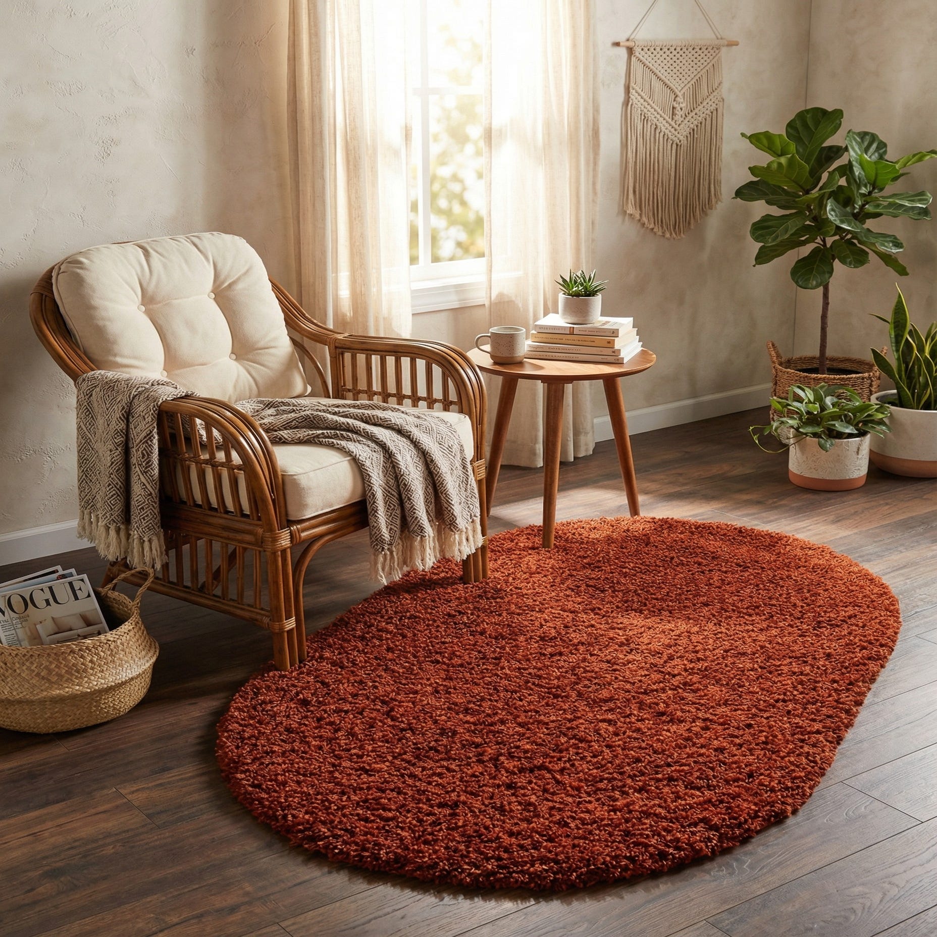 With its shaggy texture, the rug introduces a sense of depth and luxury to any room. It's an excellent choice for grounding furniture in living rooms, bedrooms, or providing a comforting welcome in entryways. The inviting shade of terracotta pairs well with neutrals for a subtle look or against contrasting blues and greens for a more dynamic effect.