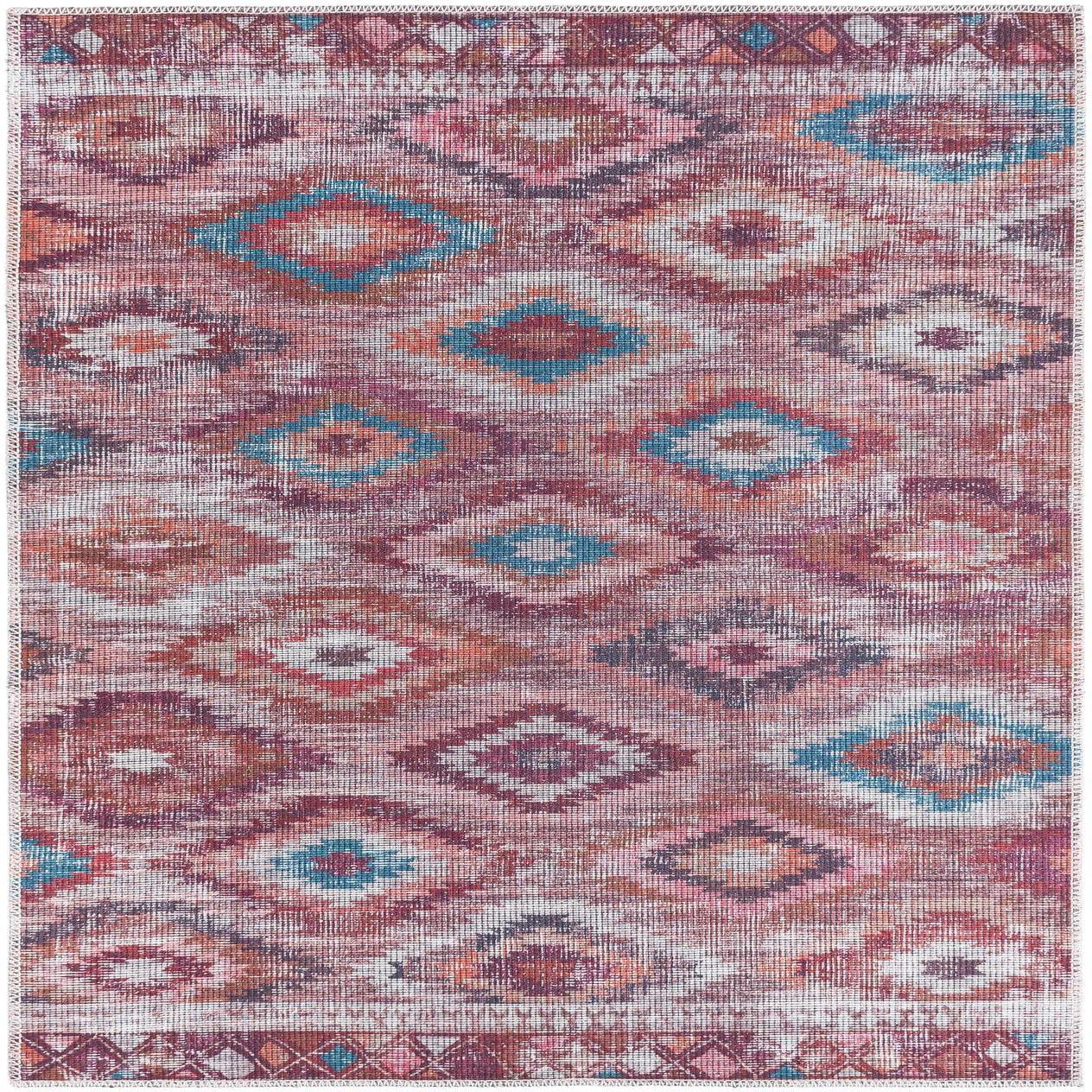 A 3x5 rectangular Sisu rug with a distressed Southwestern and tribal pattern in oranges, reds, and teal, suitable for a patio.