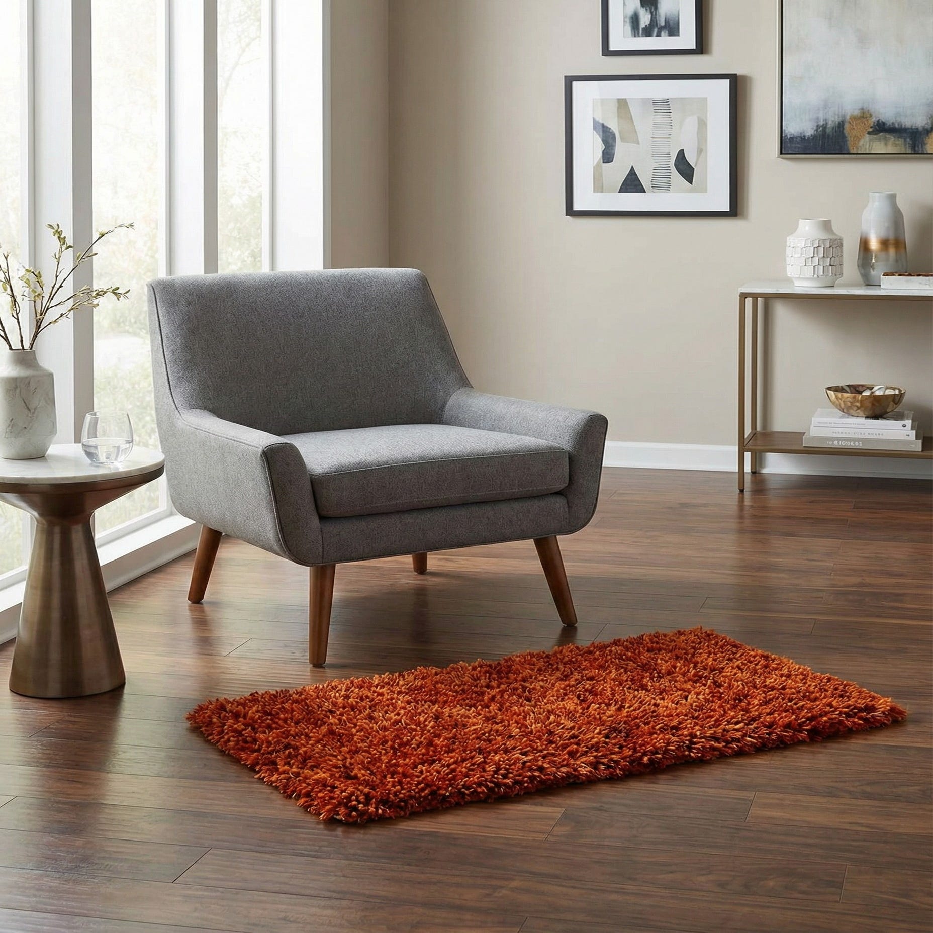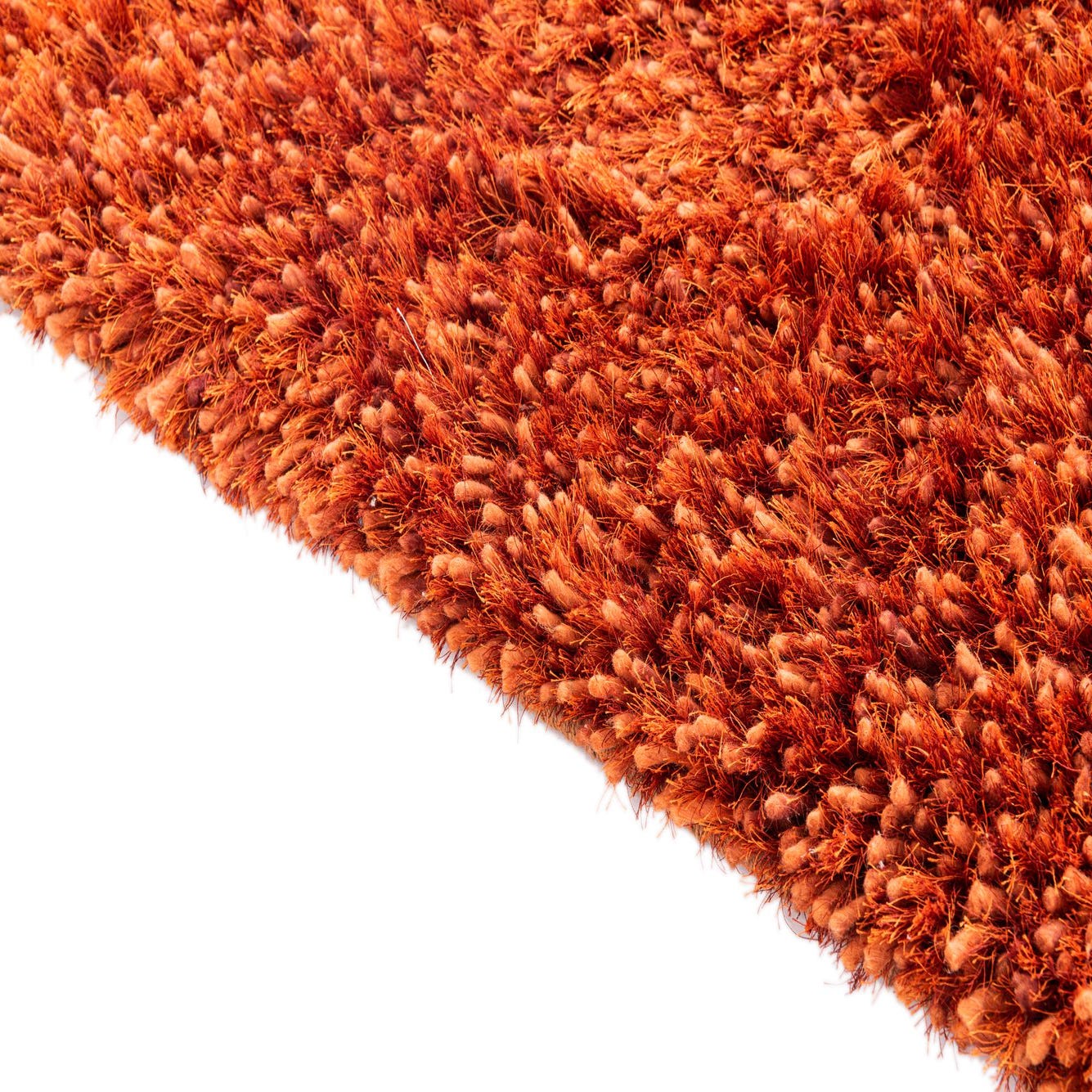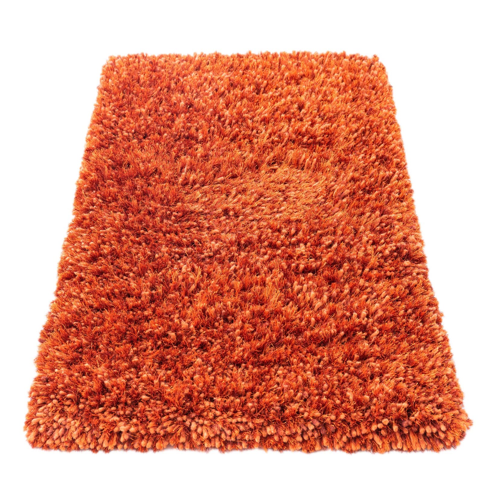 Hand-knotted in polypropylene, this shag rug presents a rich terracotta field with a dense, high-pile texture. The long, soft fibers create a plush surface that invites bare feet and adds tactile depth to a room; the uniform color is enlivened by subtle tonal shifts within the yarns, so the texture becomes the primary visual detail rather than a printed pattern. Its straightforward, solid design keeps the look modern and versatile while the shag construction provides a cozy, layered feel.