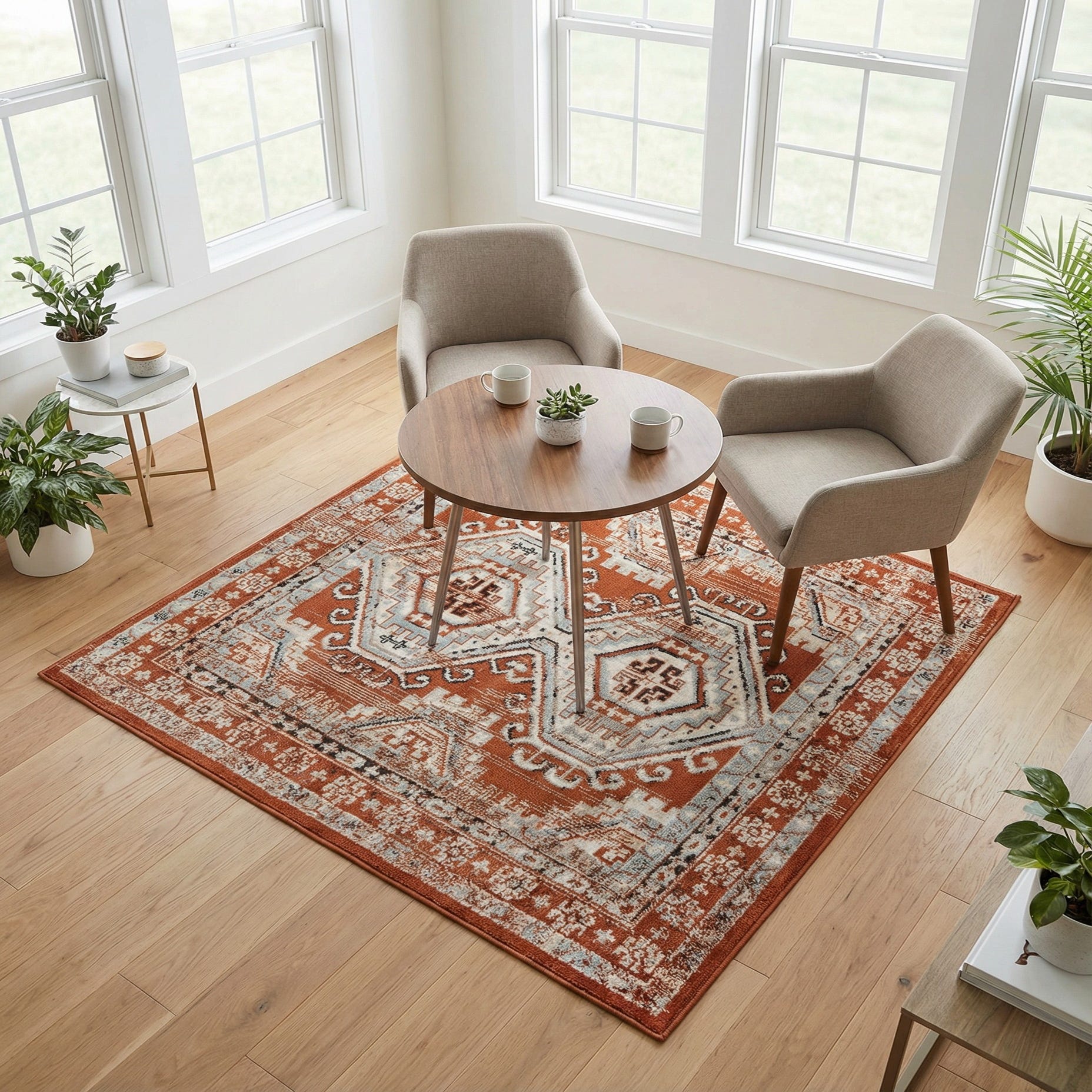 Machine-made with 100% polypropylene, the rug has a low, dense pile that feels smooth and slightly cushioned underfoot. The fiber gives the surface a soft touch while holding the design’s crisp color contrasts—terracotta, ivory, gray, and light blue—clearly across the pattern. Place this square rug under a reading chair or layered beneath a small coffee table, pair it with warm wood furniture and leather upholstery for a cozy living area, or use it to add color and pattern to a neutral bedroom. It’s equally at home in transitional, southwestern-inspired, or modern farmhouse interiors.
