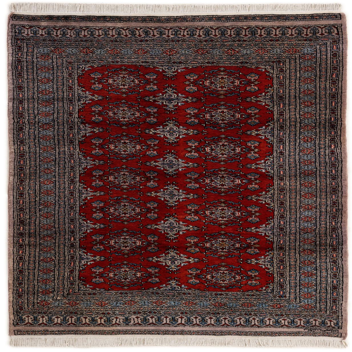 A 4x6 rectangular Bokhara rug with a deep red field and intricate tribal patterns in blue, orange, and cream, featuring a detailed border.
