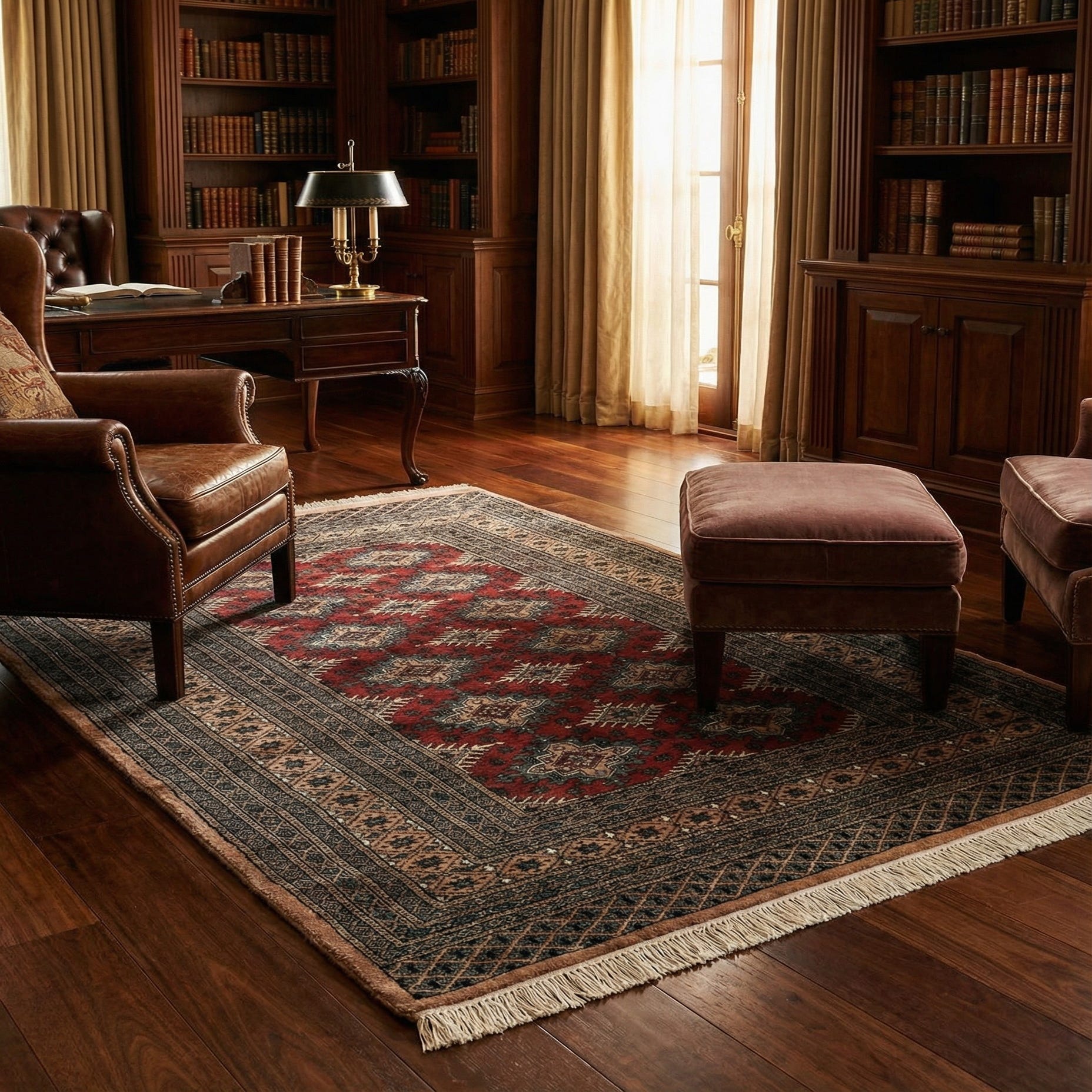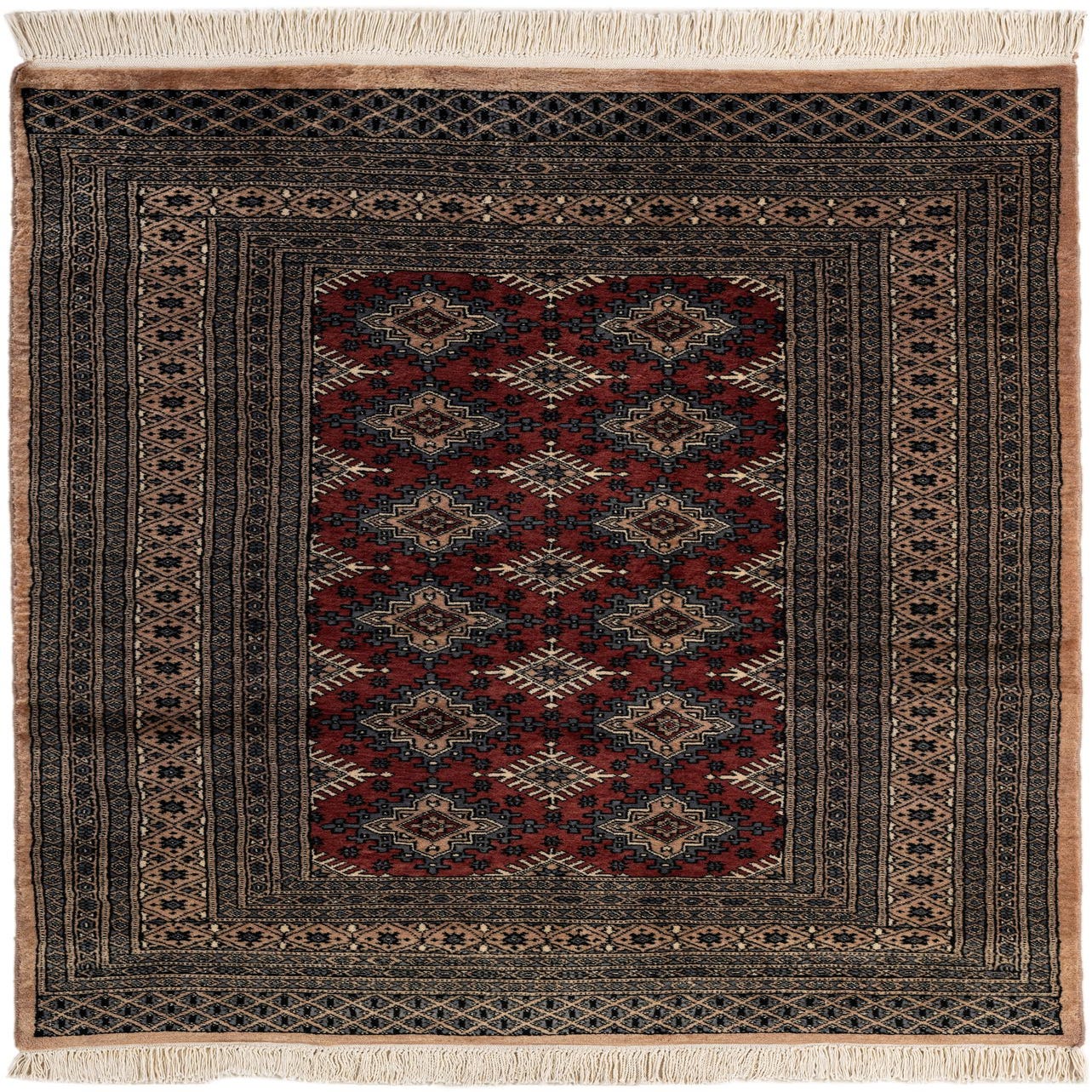 A 4x6 rectangular Bokhara rug with a deep red field and intricate tribal patterns in black and beige, featuring fringed ends.