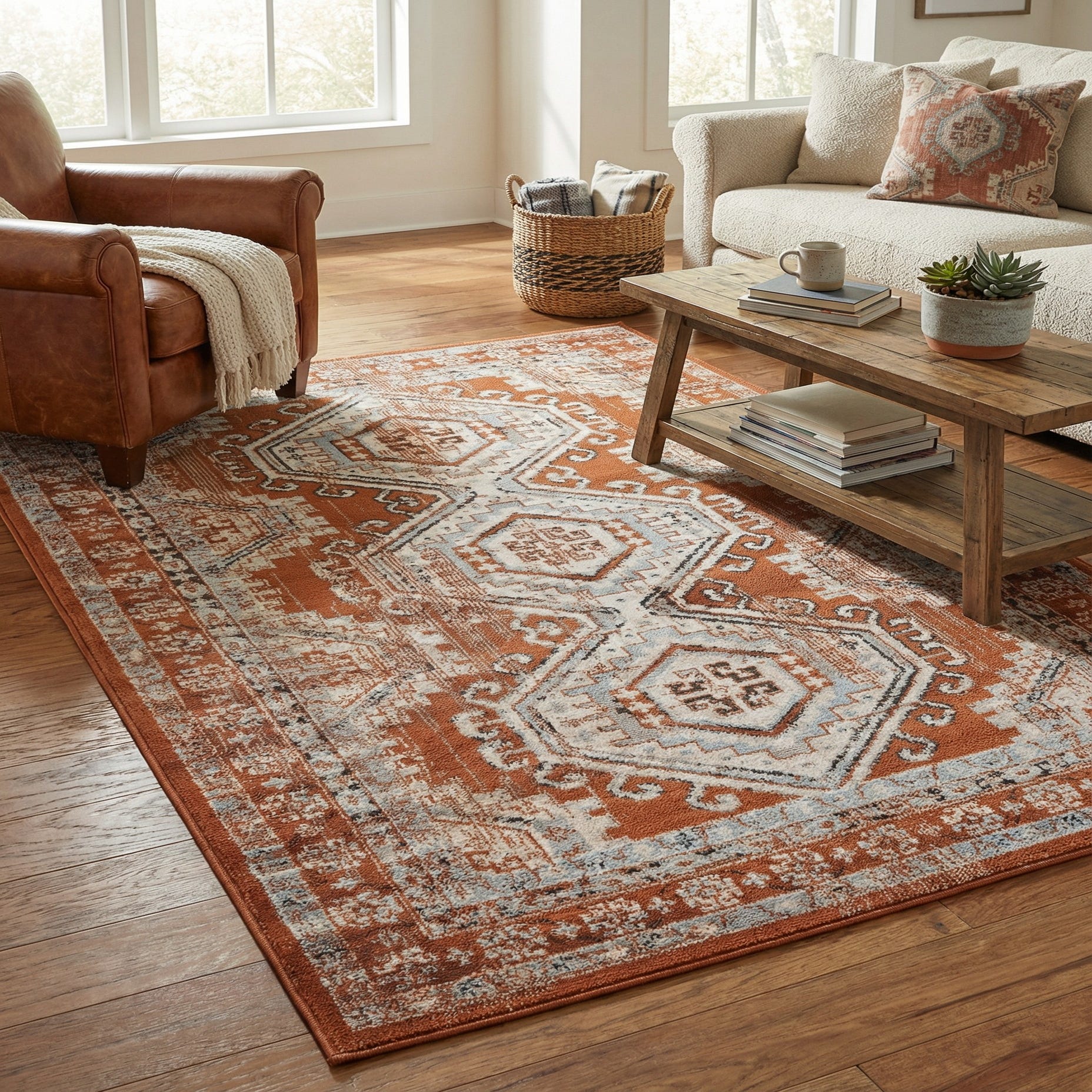 Machine-made from 100% polypropylene, the rug has a low-profile pile and a compact, even surface that feels soft underfoot and lays flat in place. Its warm terracotta field pairs nicely with natural wood tones and leather, while the light blue and ivory accents brighten neutral seating. Use it to anchor a living room seating area, warm an entryway, or add layered texture to a bedroom or home office; it also works well with bohemian textiles, mid-century lines, or farmhouse-inspired decor.