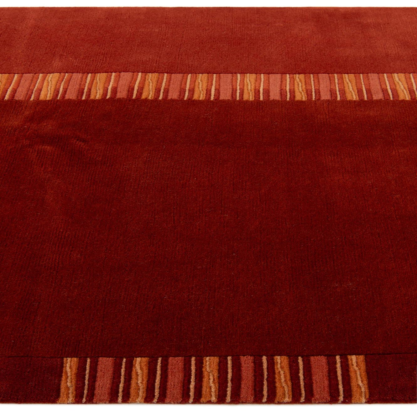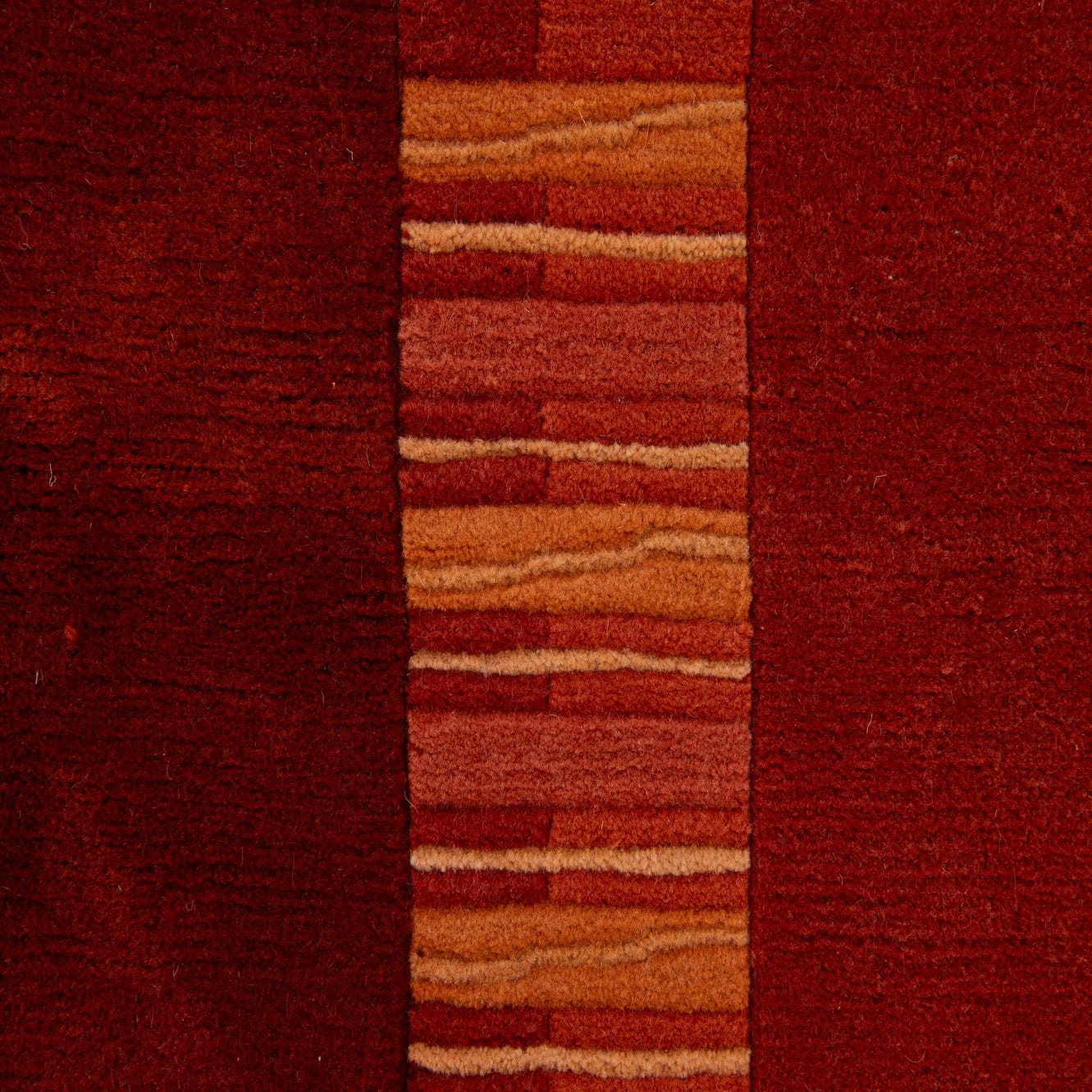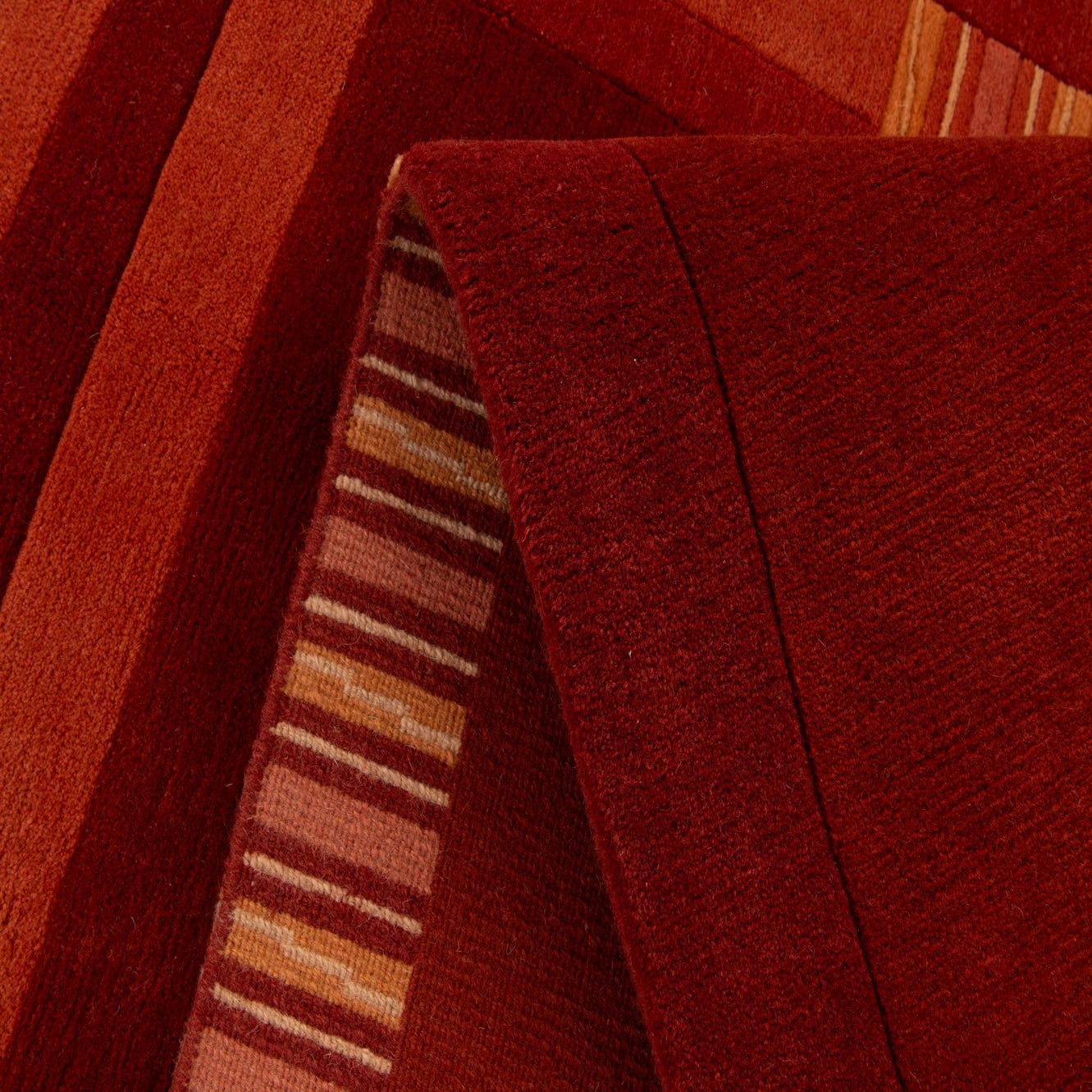 A 4x6 rectangular Nepal Collection rug in deep red and orange with a modern abstract design and striped accents.